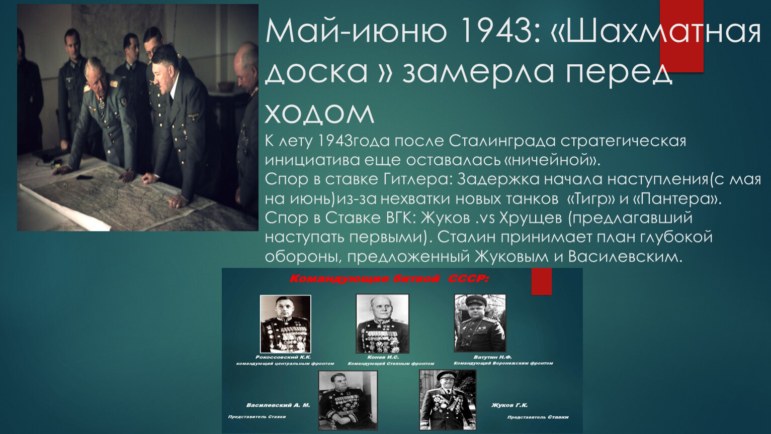 Май-июню 1943: «Шахматная доска » замерла перед ходомК лету 1943года после Сталинграда стратегическая инициатива еще оставалась «ничейной».Спор в ставке Гитлера: Задержка начала наступления(с мая на июнь)из-за нехватки новых танков «Тигр» и «Пантера».Спор в Ставке ВГК: Жуков .vs Хрущев (предлагавший наступать первыми). Сталин принимает план глубокой обороны, предложенный Жуковым и Василевским.
