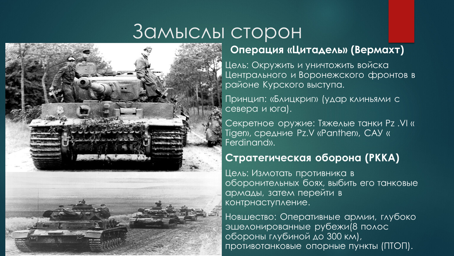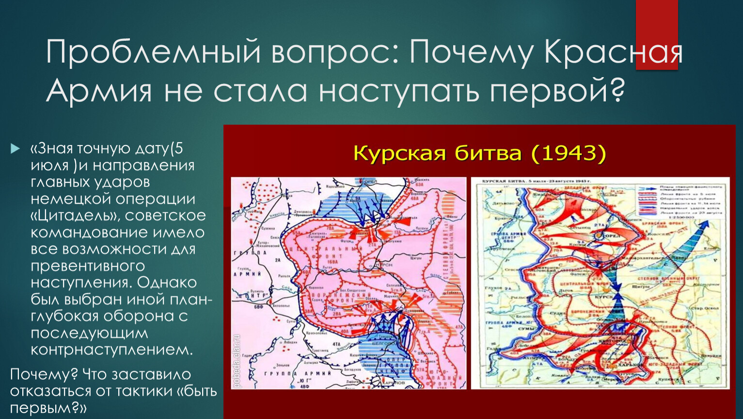 «Зная точную дату(5 июля )и направления главных ударов немецкой операции «Цитадель», советское командование имело все возможности для превентивного наступления. Однако был выбран иной план-глубокая оборона с последующим контрнаступлением.