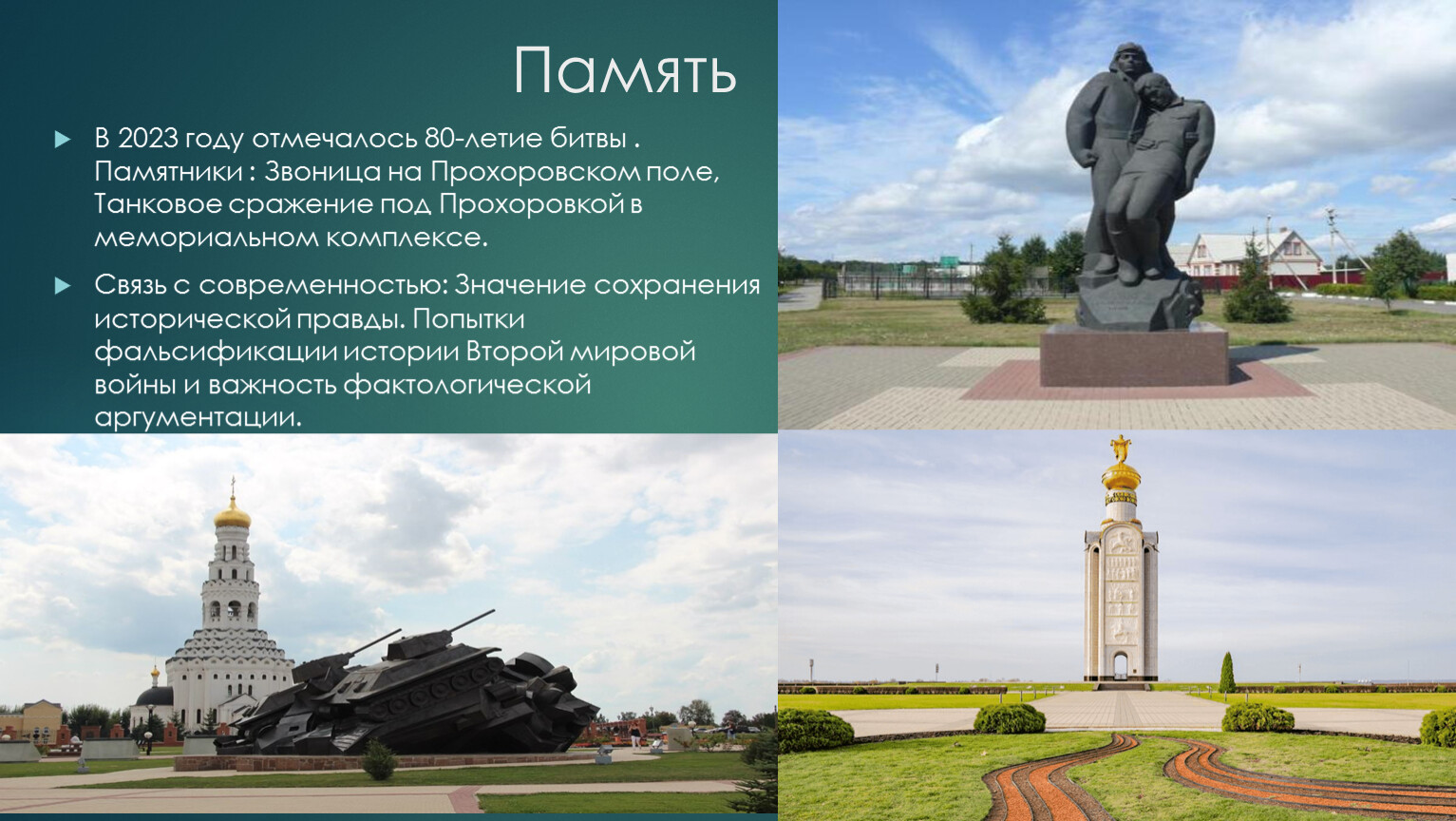 В 2023 году отмечалось 80-летие битвы . Памятники : Звоница на Прохоровском поле, Танковое сражение под Прохоровкой в мемориальном комплексе.