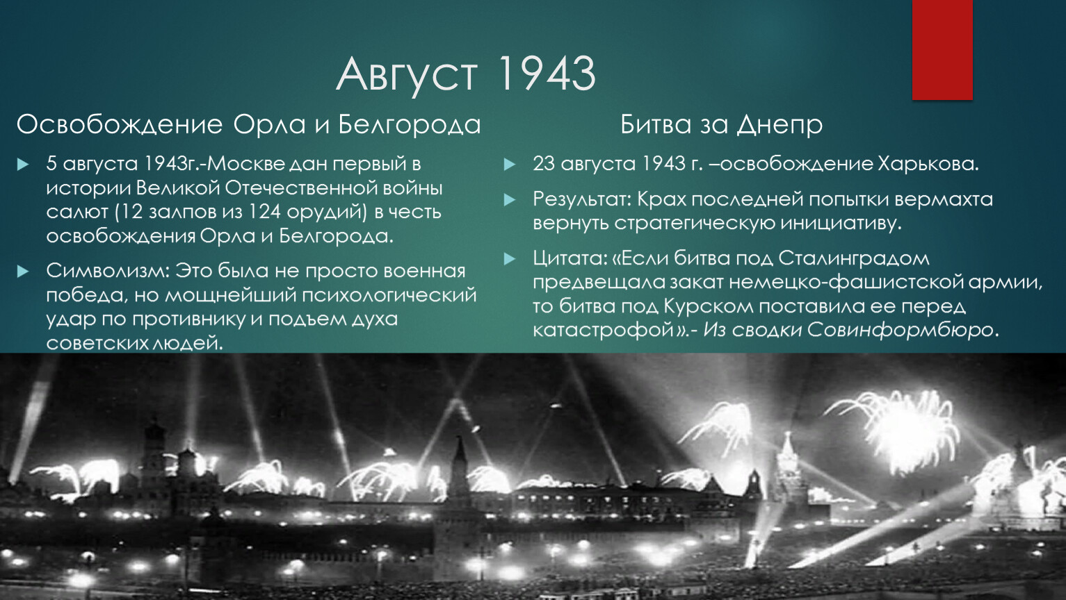 5 августа 1943г.-Москве дан первый в истории Великой Отечественной войны салют (12 залпов из 124 орудий) в честь освобождения Орла и Белгорода.