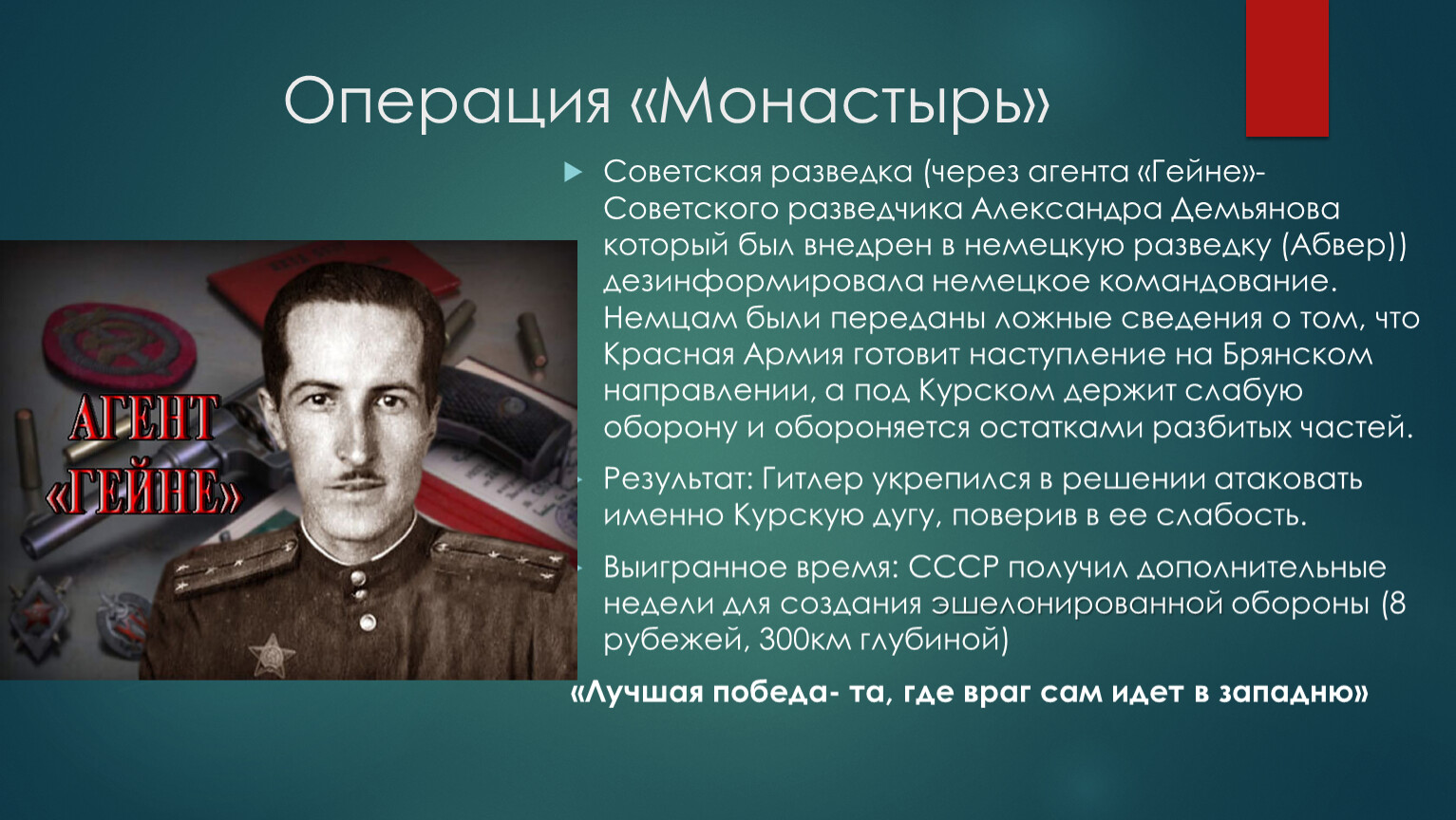Советская разведка (через агента «Гейне»- Советского разведчика Александра Демьянова который был внедрен в немецкую разведку (Абвер)) дезинформировала немецкое командование. Немцам были переданы ложные сведения о том, что Красная Армия готовит наступление на Брянском направлении, а под Курском держит слабую оборону и обороняется остатками разбитых частей.