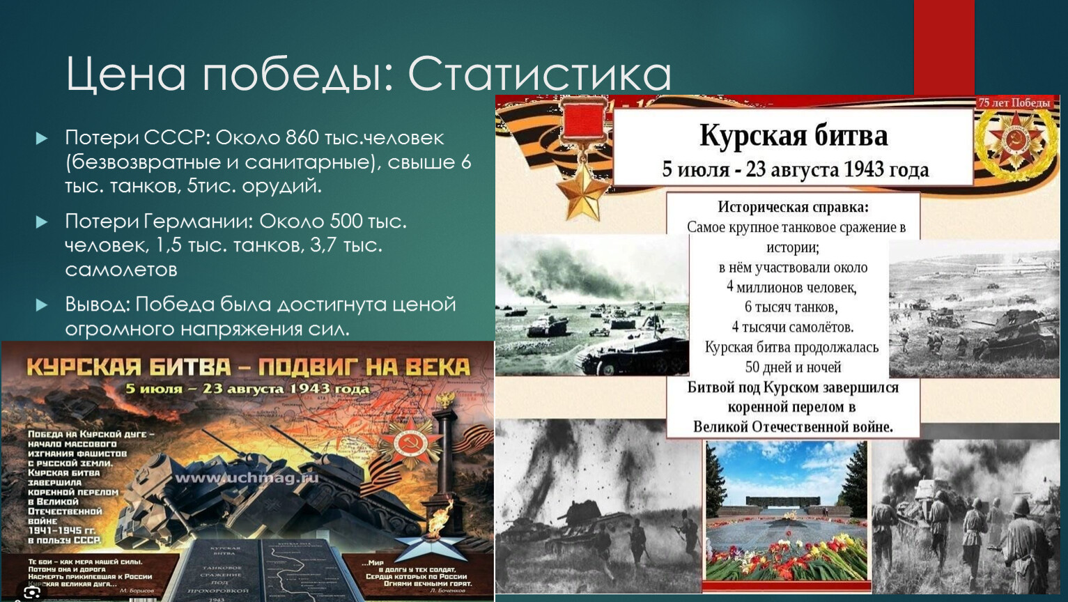 Цитата: «Если битва под Сталинградом предвещала закат немецко-фашистской армии, то битва под Курском поставила ее перед катастрофой ».- Из сводки Совинформбюро.