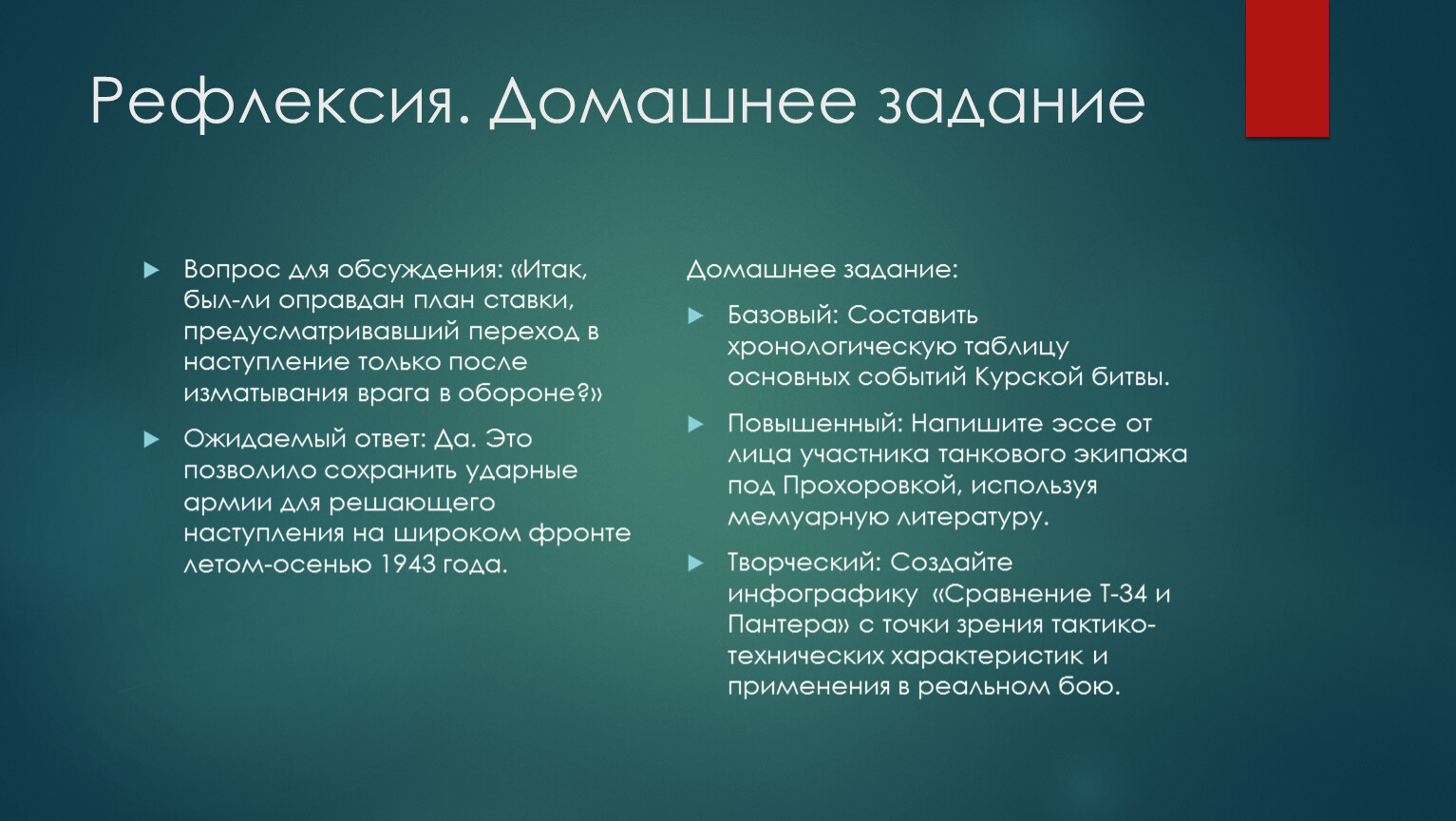Творческий: Создайте инфографику «Сравнение Т-34 и Пантера» с точки зрения тактико-технических характеристик и применения в реальном бою.