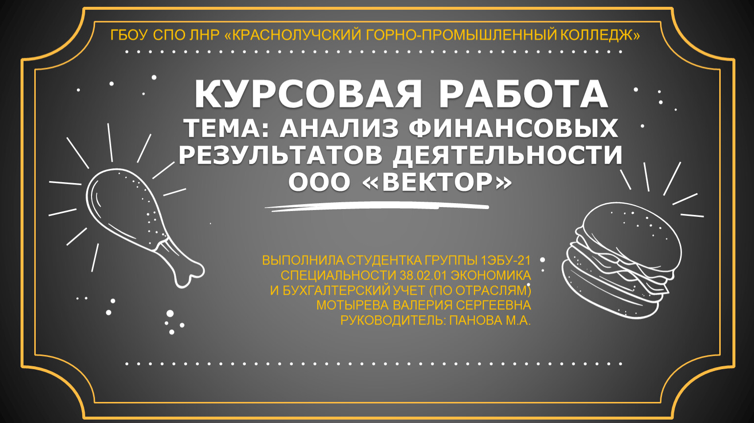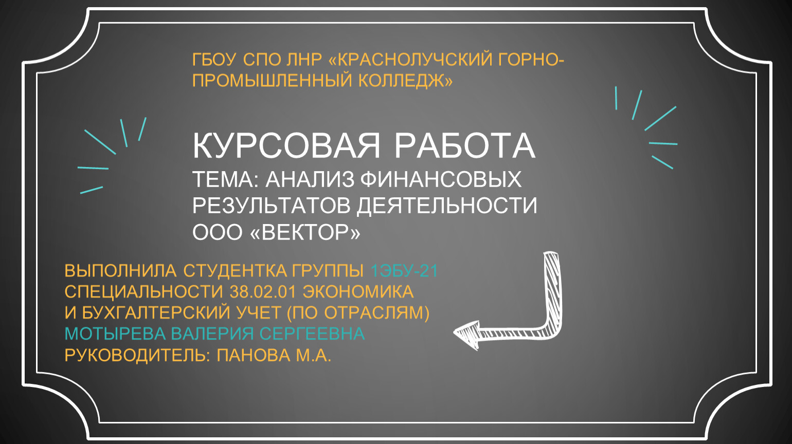 ГБОУ СПО ЛНР «КРАСНОЛУЧСКИЙ ГОРНО-ПРОМЫШЛЕННЫЙ КОЛЛЕДЖ» КУРСОВАЯ РАБОТА ТЕМА: АНАЛИЗ ФИНАНСОВЫХ РЕЗУЛЬТАТОВ ДЕЯТЕЛЬНОСТИ ООО «ВЕКТОР»