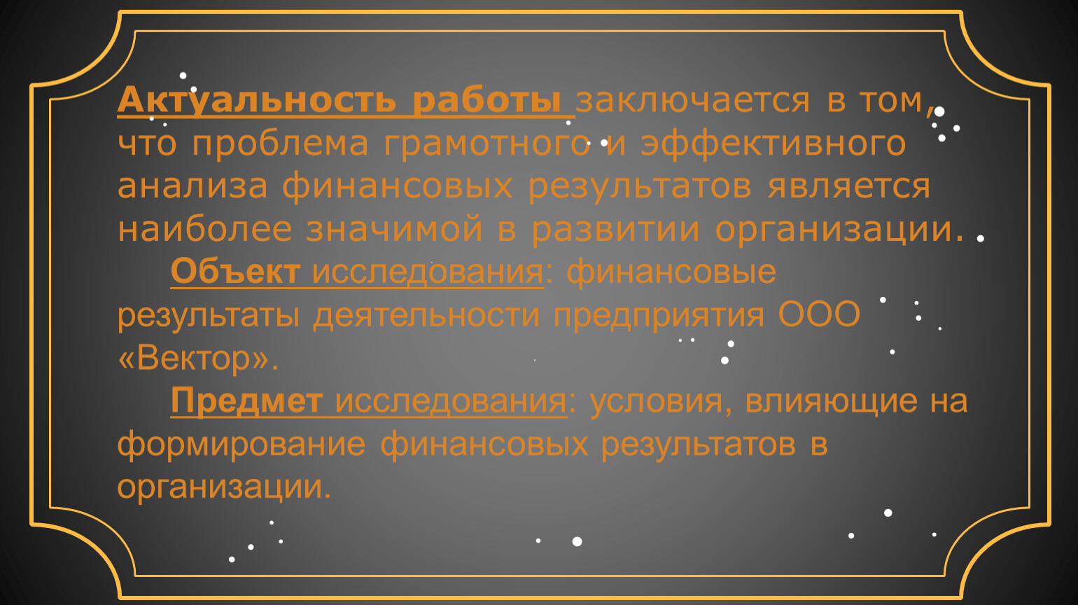 Объект исследования: финансовые результаты деятельности предприятия ООО «Вектор».