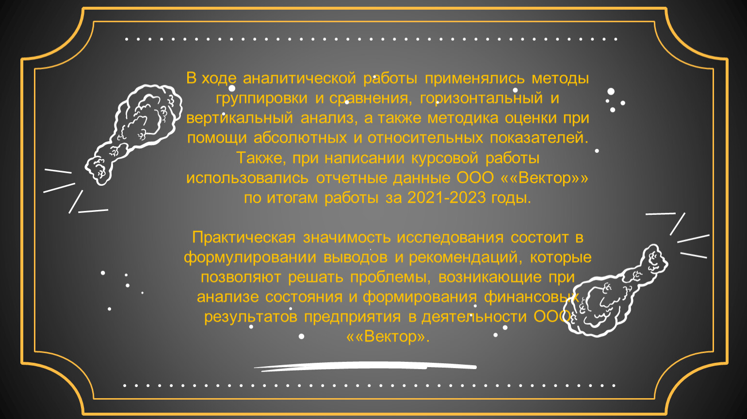 В ходе аналитической работы применялись методы группировки и сравнения, горизонтальный и вертикальный анализ, а также методика оценки при помощи абсолютных и относительных показателей. Также, при написании курсовой работы использовались отчетные данные ООО ««Вектор»» по итогам работы за 2021-2023 годы.Практическая значимость исследования состоит в формулировании выводов и рекомендаций, которые позволяют решать проблемы, возникающие при анализе состояния и формирования финансовых результатов предприятия в деятельности ООО ««Вектор».