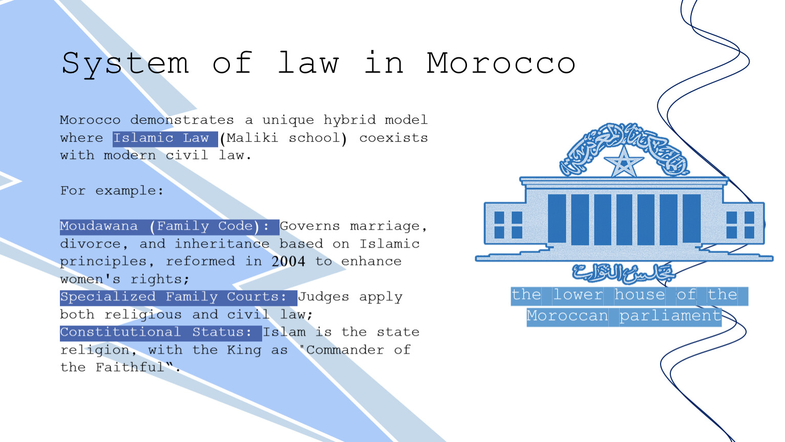 Morocco demonstrates a unique hybrid model where Islamic Law (Maliki school) coexists with modern civil law.For example:Moudawana (Family Code): Governs marriage, divorce, and inheritance based on Islamic principles, reformed in 2004 to enhance women's rights;Specialized Family Courts: Judges apply both religious and civil law;Constitutional Status: Islam is the state religion, with the King as "Commander of the Faithful“.