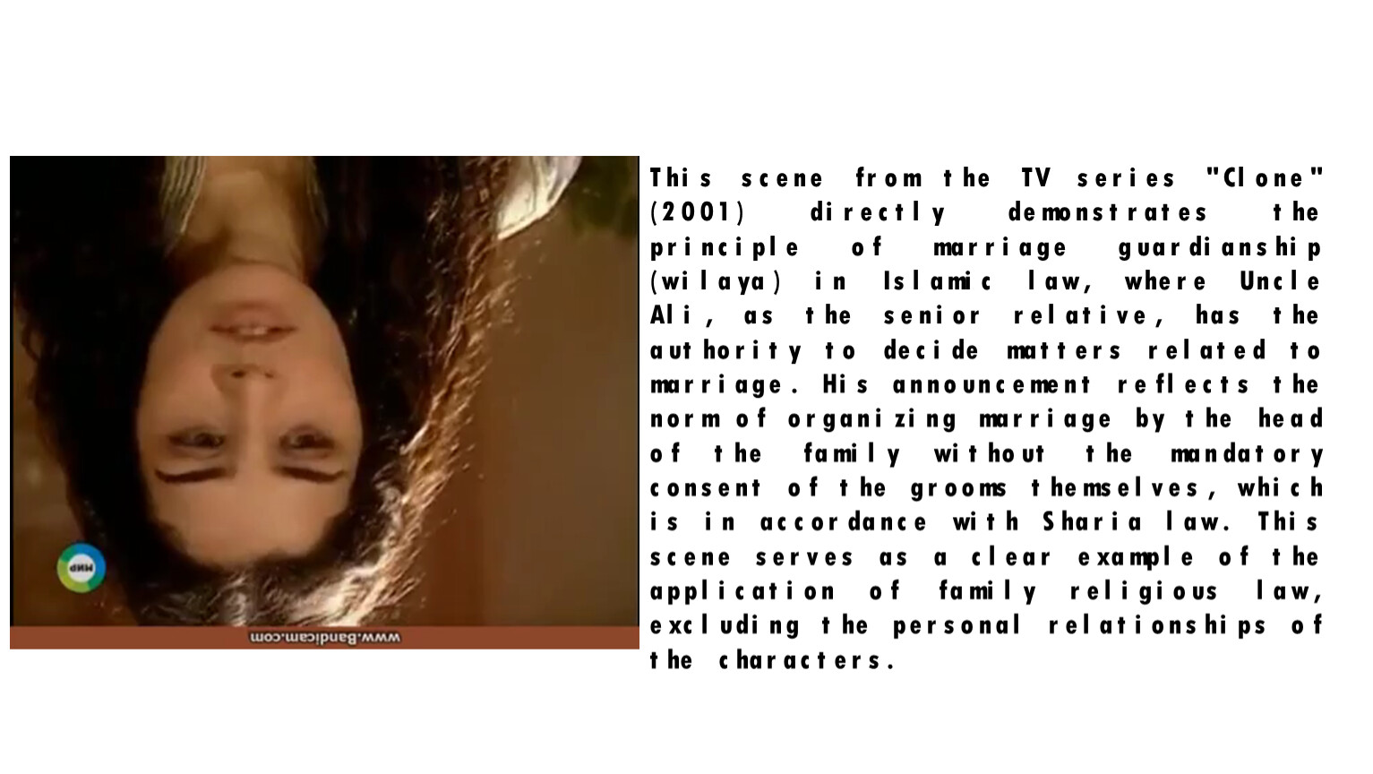 This scene from the TV series "Clone" (2001) directly demonstrates the principle of marriage guardianship (wilaya) in Islamic law, where Uncle Ali, as the senior relative, has the authority to decide matters related to marriage. His announcement reflects the norm of organizing marriage by the head of the family without the mandatory consent of the grooms themselves, which is in accordance with Sharia law. This scene serves as a clear example of the application of family religious law, excluding the personal relationships of the characters.