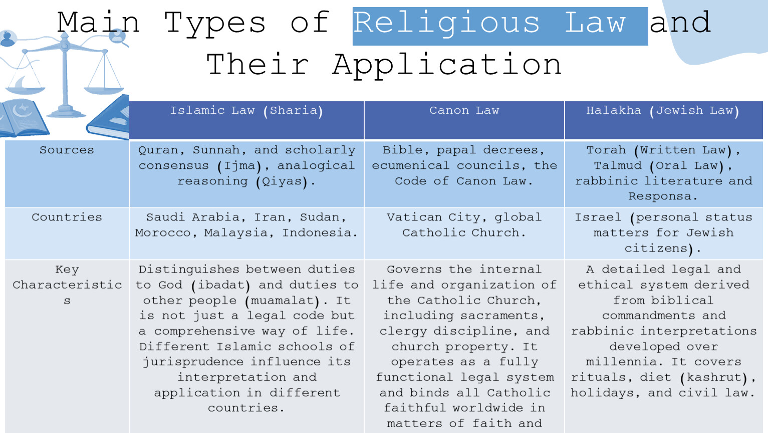 Key Characteristics | Distinguishes between duties to God (ibadat) and duties to other people (muamalat). It is not just a legal code but a comprehensive way of life. Different Islamic schools of jurisprudence influence its interpretation and application in different countries. | Governs the internal life and organization of the Catholic Church, including sacraments, clergy discipline, and church property. It operates as a fully functional legal system and binds all Catholic faithful worldwide in matters of faith and church order. | A detailed legal and ethical system derived from biblical commandments and rabbinic interpretations developed over millennia. It covers rituals, diet (kashrut), holidays, and civil law. |
