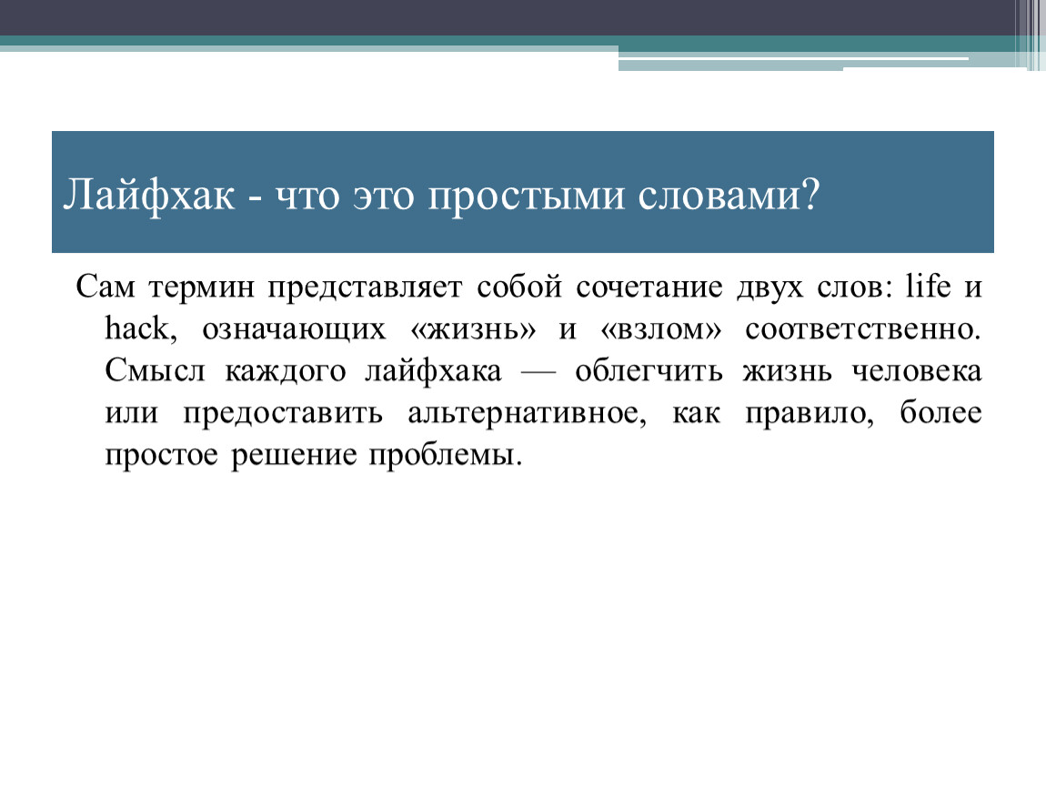 Сам термин представляет собой сочетание двух слов: life и hack, означающих «жизнь» и «взлом» соответственно. Смысл каждого лайфхака — облегчить жизнь человека или предоставить альтернативное, как правило, более простое решение проблемы.