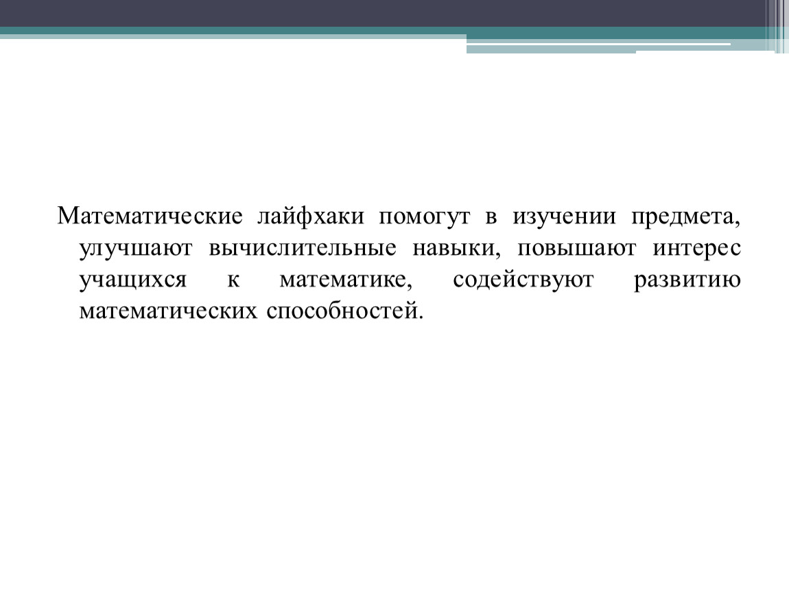 Математические лайфхаки помогут в изучении предмета, улучшают вычислительные навыки, повышают интерес учащихся к математике, содействуют развитию математических способностей.
