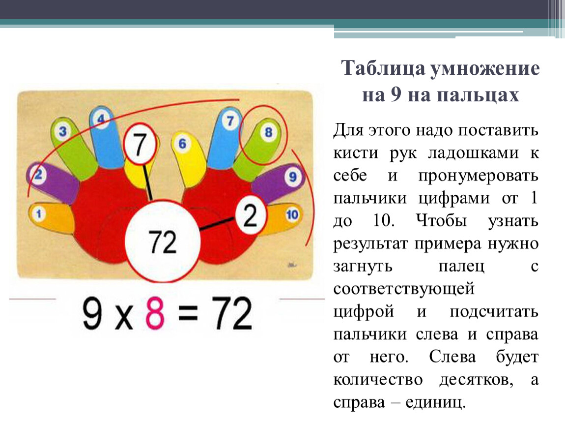 Для этого надо поставить кисти рук ладошками к себе и пронумеровать пальчики цифрами от 1 до 10. Чтобы узнать результат примера нужно загнуть палец с соответствующей цифрой и подсчитать пальчики слева и справа от него. Слева будет количество десятков, а справа – единиц.