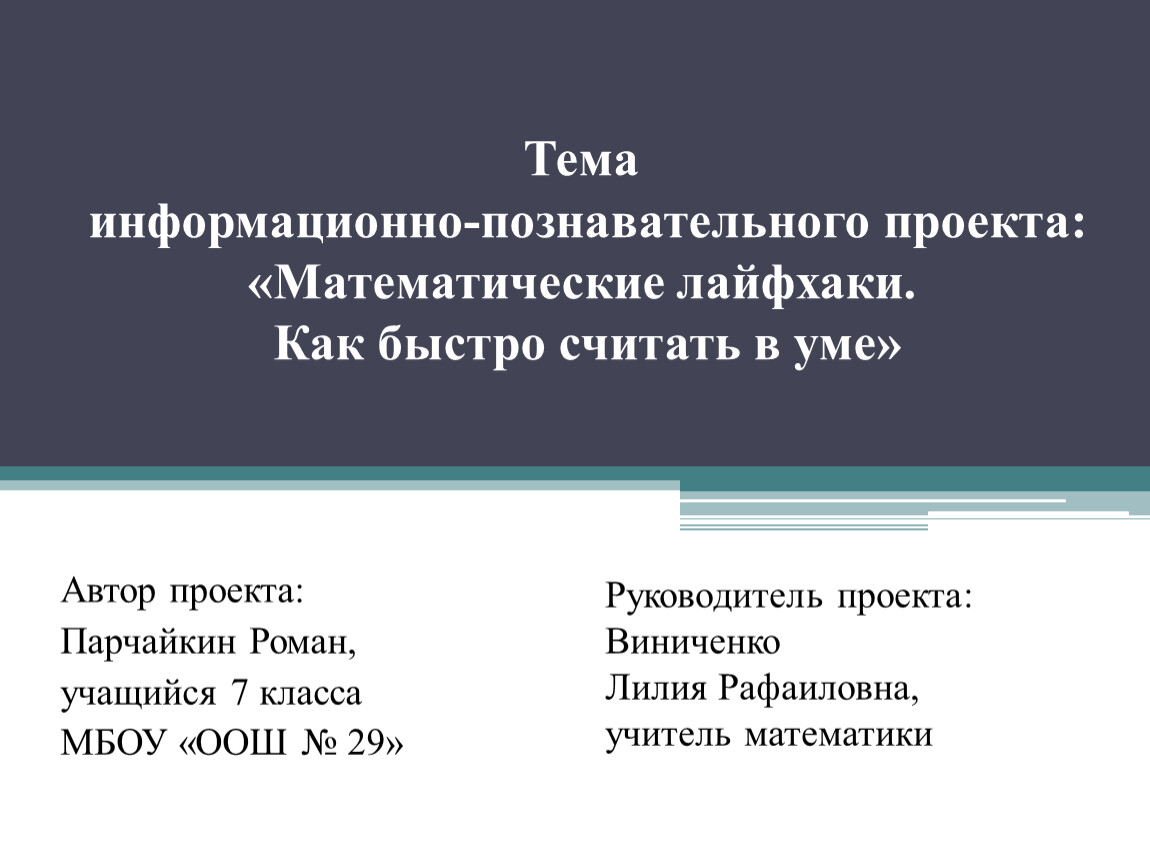 Тема информационно-познавательного проекта:«Математические лайфхаки. Как быстро считать в уме»