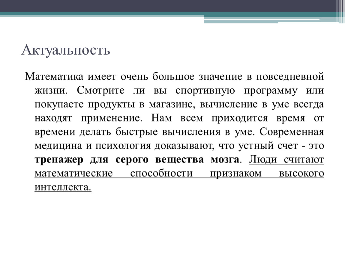 Математика имеет очень большое значение в повседневной жизни. Смотрите ли вы спортивную программу или покупаете продукты в магазине, вычисление в уме всегда находят применение. Нам всем приходится время от времени делать быстрые вычисления в уме. Современная медицина и психология доказывают, что устный счет - это тренажер для серого вещества мозга. Люди считают математические способности признаком высокого интеллекта.