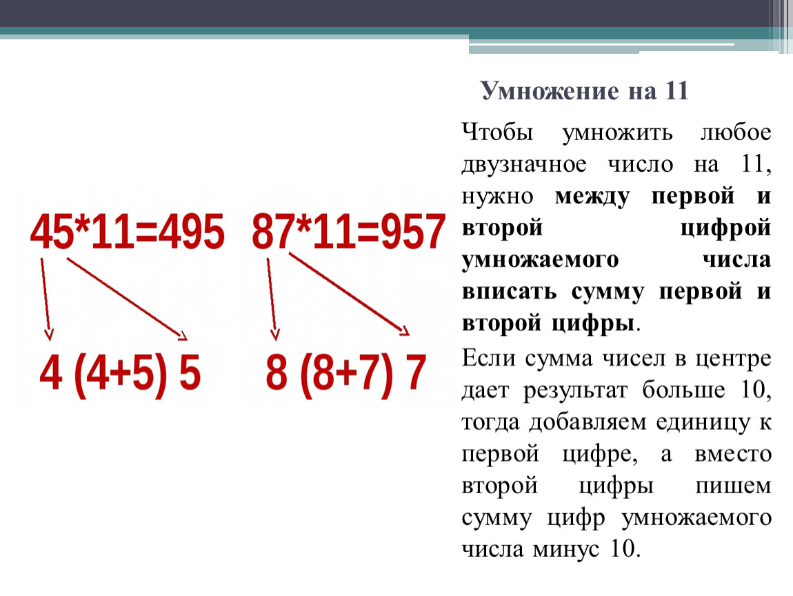 Чтобы умножить любое двузначное число на 11, нужно между первой и второй цифрой умножаемого числа вписать сумму первой и второй цифры.