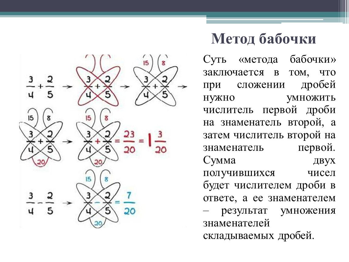 Суть «метода бабочки» заключается в том, что при сложении дробей нужно умножить числитель первой дроби на знаменатель второй, а затем числитель второй на знаменатель первой. Сумма двух получившихся чисел будет числителем дроби в ответе, а ее знаменателем – результат умножения знаменателей складываемых дробей.