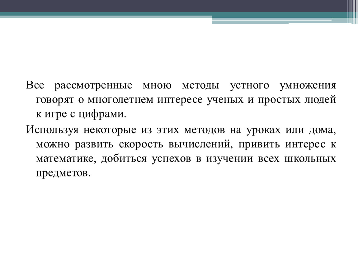 Все рассмотренные мною методы устного умножения говорят о многолетнем интересе ученых и простых людей к игре с цифрами.