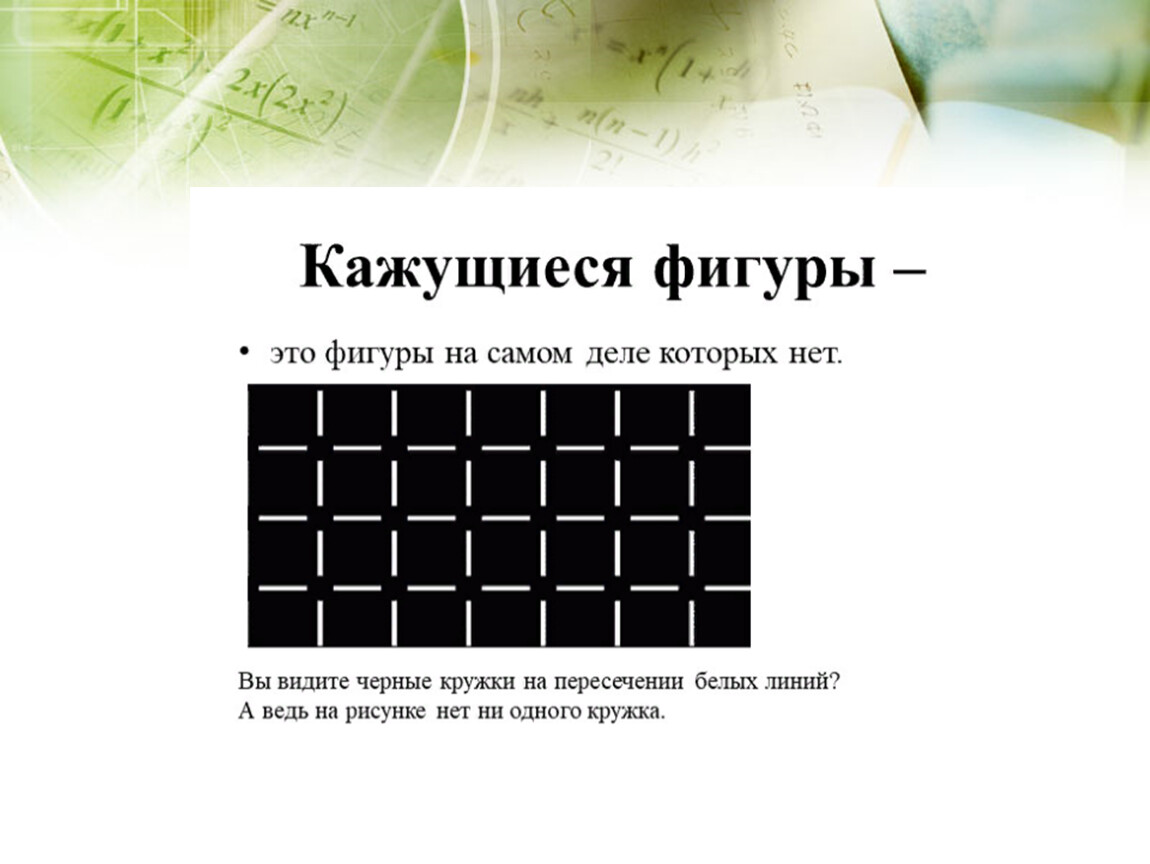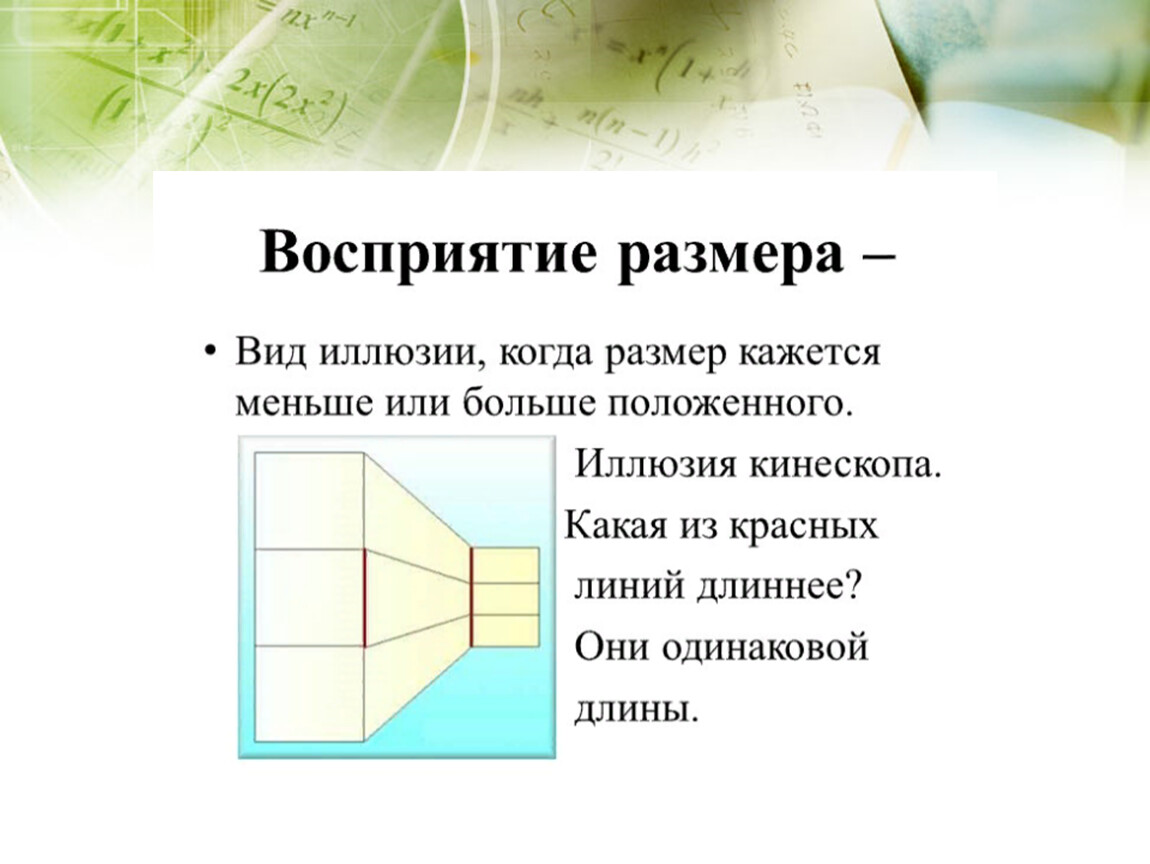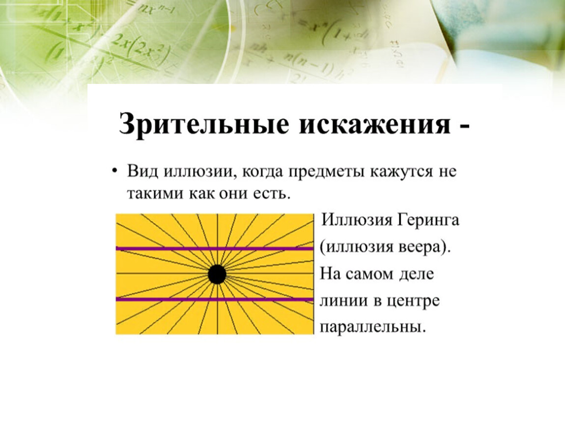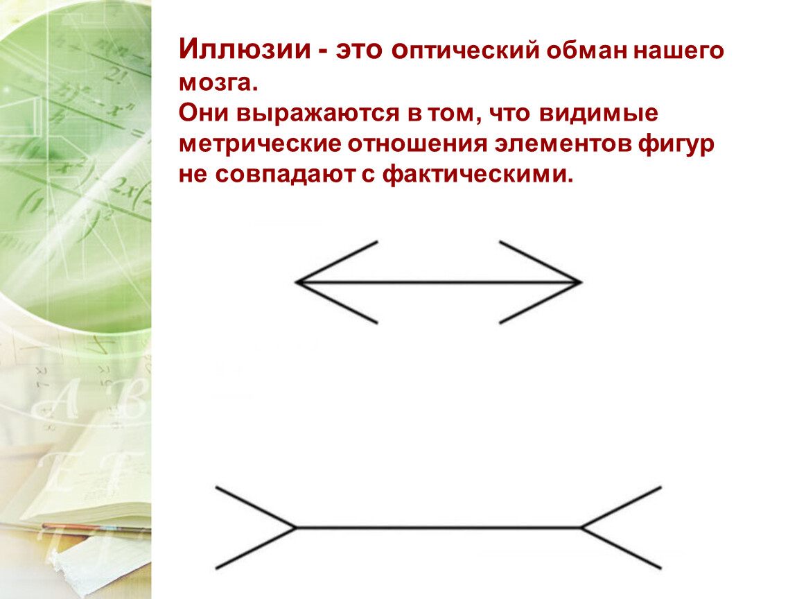 Они выражаются в том, что видимые метрические отношения элементов фигур не совпадают с фактическими.