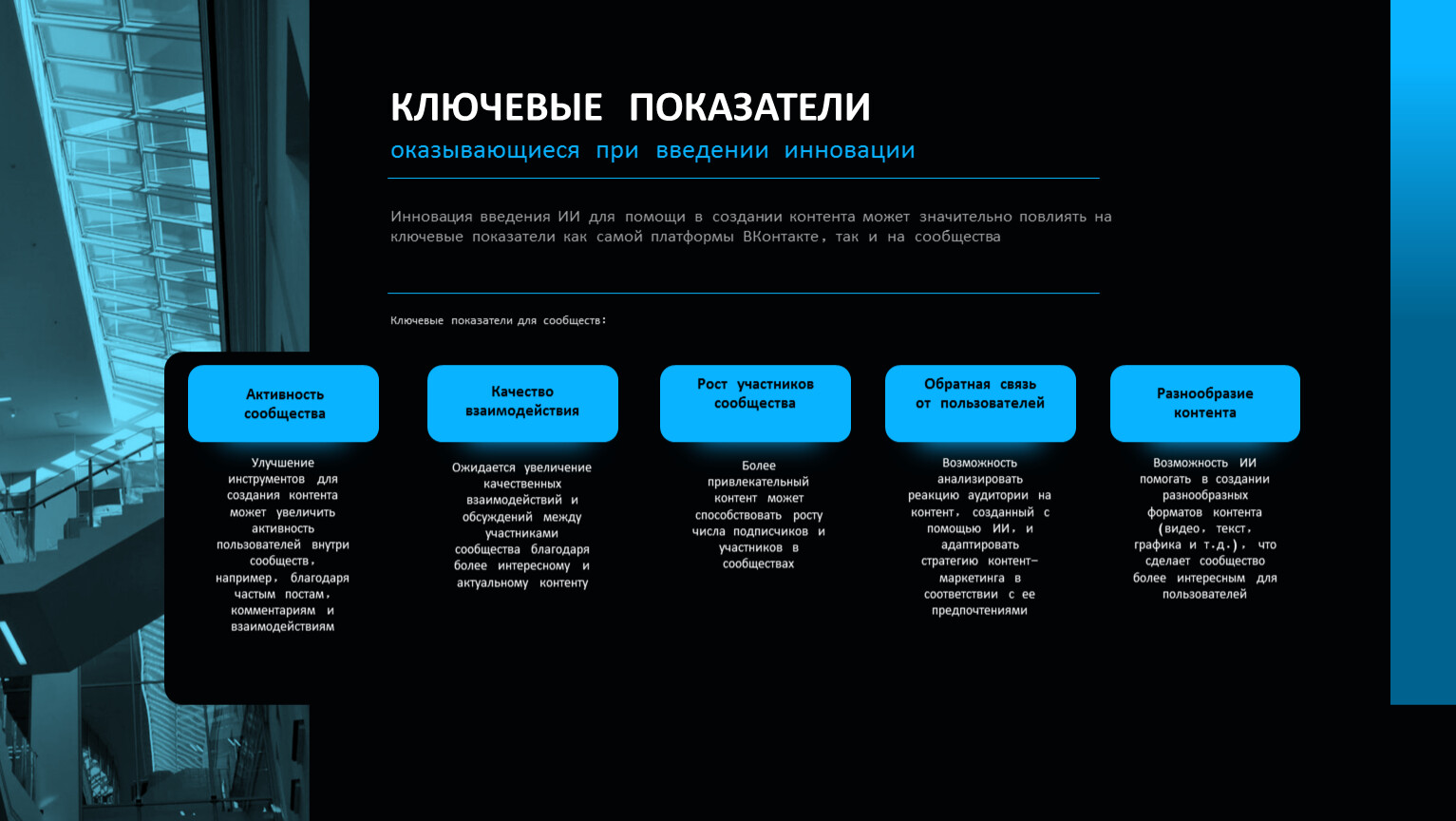 Инновация введения ИИ для помощи в создании контента может значительно повлиять на ключевые показатели как самой платформы ВКонтакте, так и на сообщества