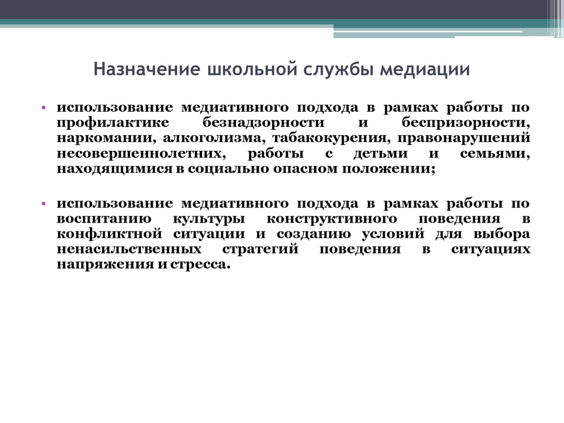 использование медиативного подхода в рамках работы по профилактике безнадзорности и беспризорности, наркомании, алкоголизма, табакокурения, правонарушений несовершеннолетних, работы с детьми и семьями, находящимися в социально опасном положении;