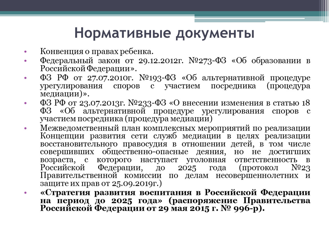 Методические рекомендации по внедрению восстановительных технологий(в том числе медиации) в воспитательную деятельность образовательных организаций (письмо МИНОБРНАУКИ РФ N077657 о26.12.2017г.).