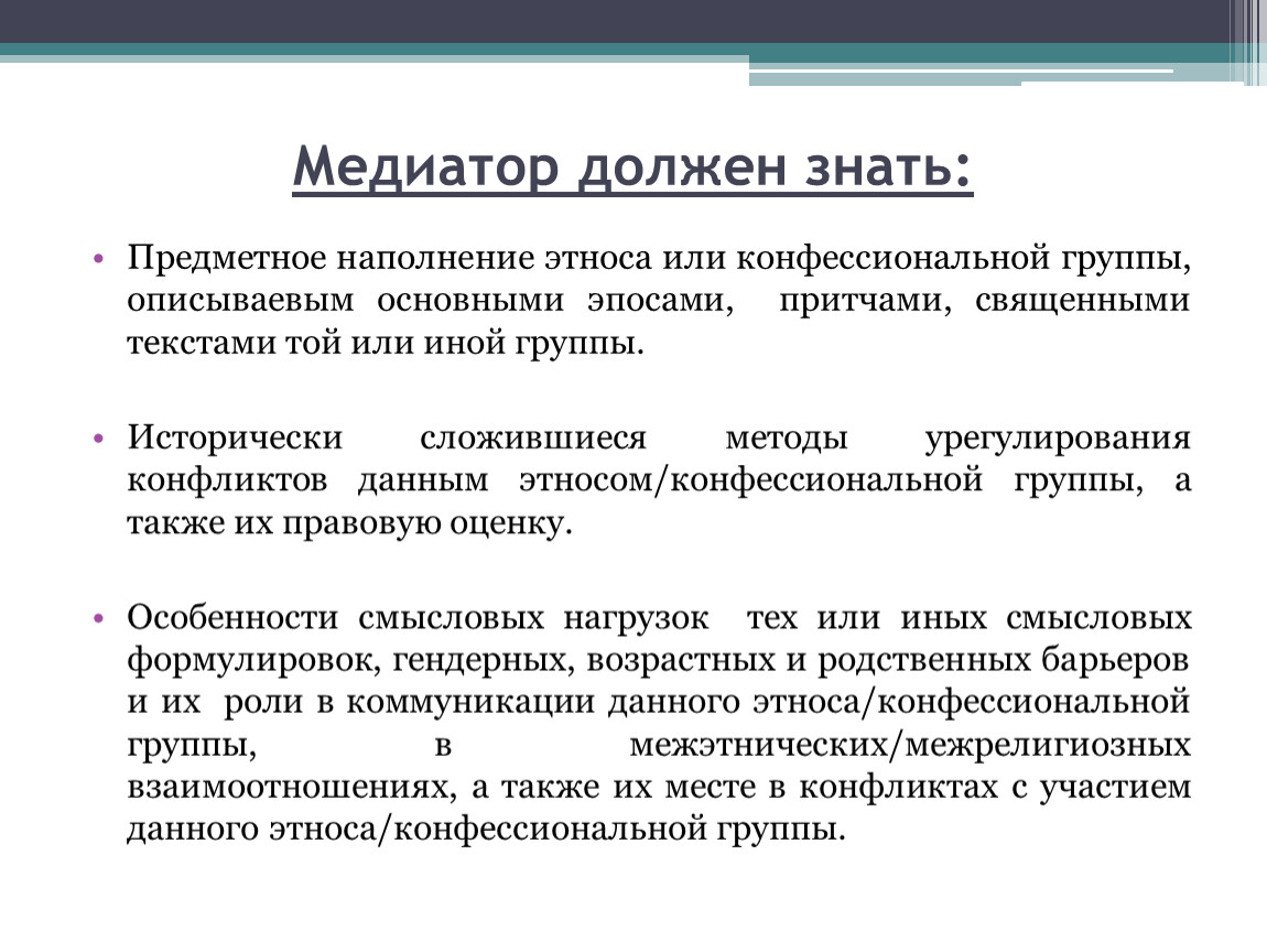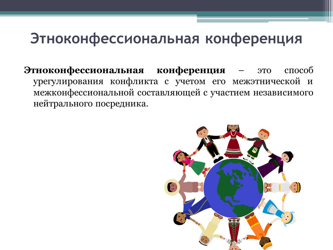 Этноконфессиональная конференция – это способ урегулирования конфликта с учетом его межэтнической и межконфессиональной составляющей с участием независимого нейтрального посредника.