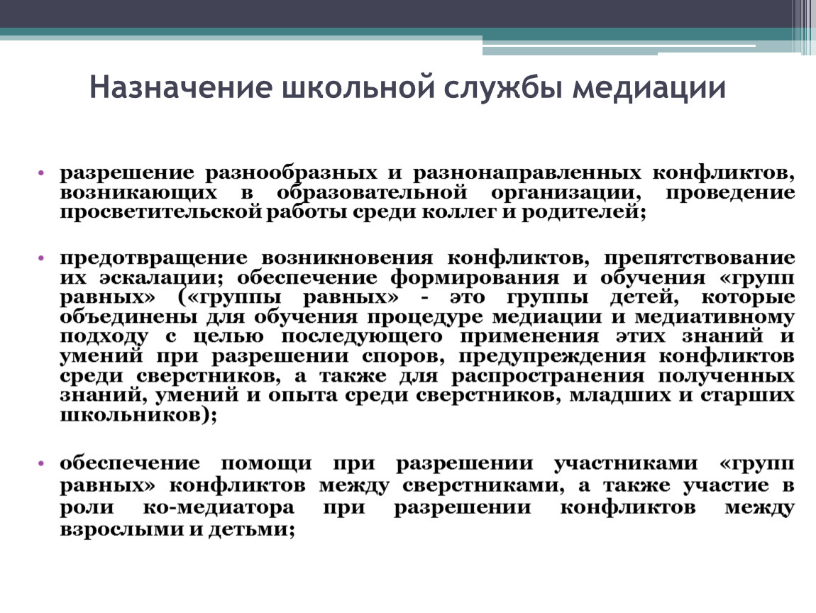 предотвращение возникновения конфликтов, препятствование их эскалации; обеспечение формирования и обучения «групп равных» («группы равных» - это группы детей, которые объединены для обучения процедуре медиации и медиативному подходу с целью последующего применения этих знаний и умений при разрешении споров, предупреждения конфликтов среди сверстников, а также для распространения полученных знаний, умений и опыта среди сверстников, младших и старших школьников);