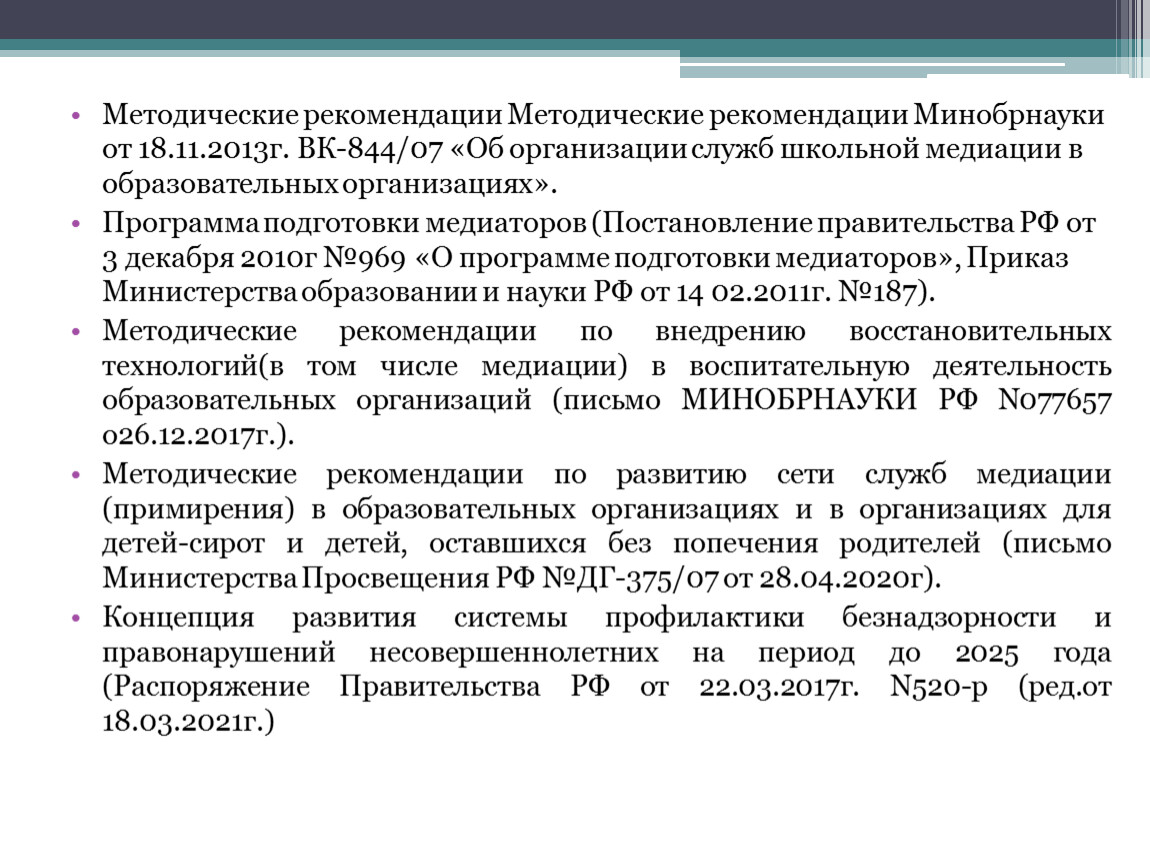 Методические рекомендации Методические рекомендации Минобрнауки от 18.11.2013г. ВК-844/07 «Об организации служб школьной медиации в образовательных организациях».