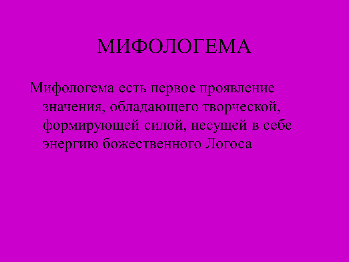 Мифологема есть первое проявление значения, обладающего творческой, формирующей силой, несущей в себе энергию божественного Логоса