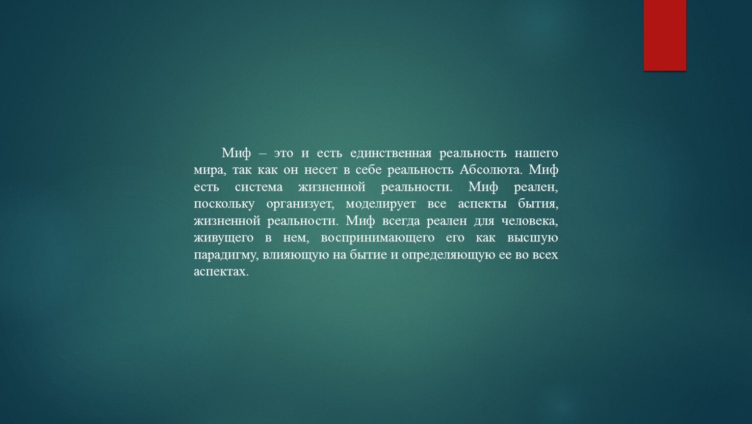 Миф – это и есть единственная реальность нашего мира, так как он несет в себе реальность Абсолюта. Миф есть система жизненной реальности. Миф реален, поскольку организует, моделирует все аспекты бытия, жизненной реальности. Миф всегда реален для человека, живущего в нем, воспринимающего его как высшую парадигму, влияющую на бытие и определяющую ее во всех аспектах.