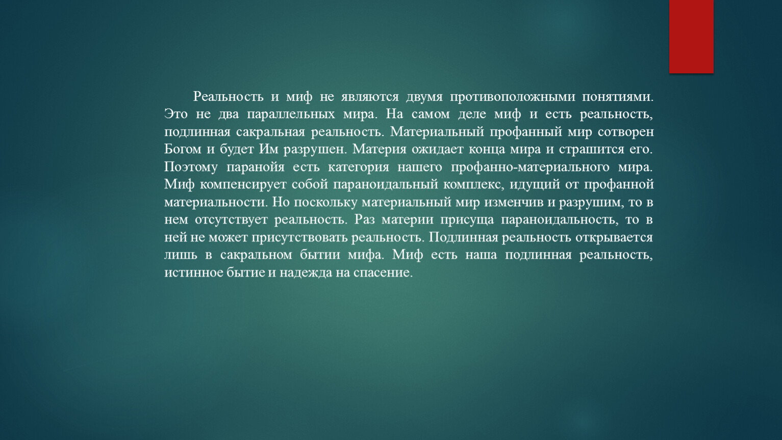 Реальность и миф не являются двумя противоположными понятиями. Это не два параллельных мира. На самом деле миф и есть реальность, подлинная сакральная реальность. Материальный профанный мир сотворен Богом и будет Им разрушен. Материя ожидает конца мира и страшится его. Поэтому паранойя есть категория нашего профанно-материального мира. Миф компенсирует собой параноидальный комплекс, идущий от профанной материальности. Но поскольку материальный мир изменчив и разрушим, то в нем отсутствует реальность. Раз материи присуща параноидальность, то в ней не может присутствовать реальность. Подлинная реальность открывается лишь в сакральном бытии мифа. Миф есть наша подлинная реальность, истинное бытие и надежда на спасение.