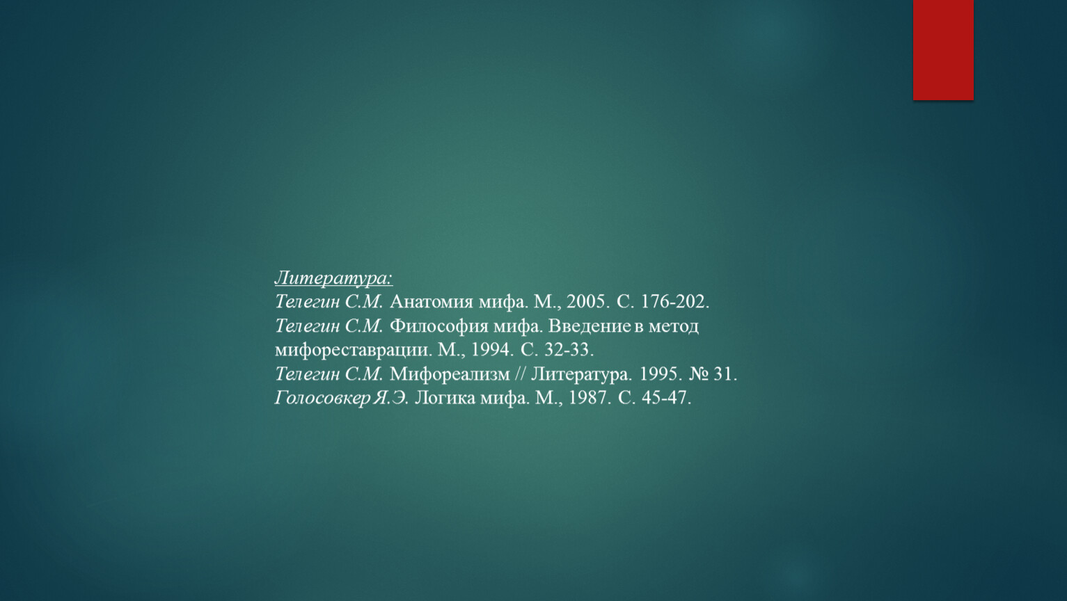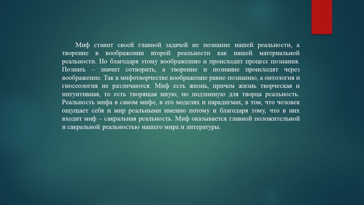 Миф ставит своей главной задачей не познание нашей реальности, а творение в воображении второй реальности как нашей материальной реальности. Но благодаря этому воображению и происходит процесс познания. Познать – значит сотворить, а творение и познание происходят через воображение. Так в мифотворчестве воображение равно познанию, а онтология и гносеология не различаются. Миф есть жизнь, причем жизнь творческая и интуитивная, то есть творящая иную, но подлинную для творца реальность. Реальность мифа в самом мифе, в его моделях и парадигмах, в том, что человек ощущает себя и мир реальными именно потому и благодаря тому, что в них входит миф – сакральная реальность. Миф оказывается главной положительной и сакральной реальностью нашего мира и литературы.