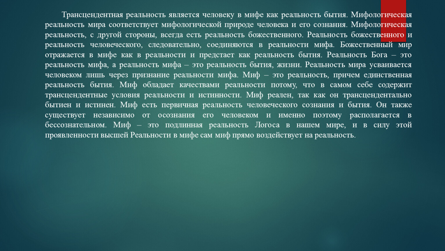 Трансцендентная реальность является человеку в мифе как реальность бытия. Мифологическая реальность мира соответствует мифологической природе человека и его сознания. Мифологическая реальность, с другой стороны, всегда есть реальность божественного. Реальность божественного и реальность человеческого, следовательно, соединяются в реальности мифа. Божественный мир отражается в мифе как в реальности и предстает как реальность бытия. Реальность Бога – это реальность мифа, а реальность мифа – это реальность бытия, жизни. Реальность мира усваивается человеком лишь через признание реальности мифа. Миф – это реальность, причем единственная реальность бытия. Миф обладает качествами реальности потому, что в самом себе содержит трансцендентные условия реальности и истинности. Миф реален, так как он трансцендентально бытиен и истинен. Миф есть первичная реальность человеческого сознания и бытия. Он также существует независимо от осознания его человеком и именно поэтому располагается в бессознательном. Миф – это подлинная реальность Логоса в нашем мире, и в силу этой проявленности высшей Реальности в мифе сам миф прямо воздействует на реальность.
