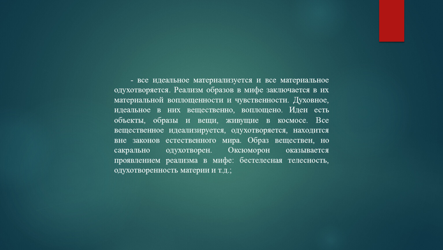 - все идеальное материализуется и все материальное одухотворяется. Реализм образов в мифе заключается в их материальной воплощенности и чувственности. Духовное, идеальное в них вещественно, воплощено. Идеи есть объекты, образы и вещи, живущие в космосе. Все вещественное идеализируется, одухотворяется, находится вне законов естественного мира. Образ веществен, но сакрально одухотворен. Оксюморон оказывается проявлением реализма в мифе: бестелесная телесность, одухотворенность материи и т.д.;