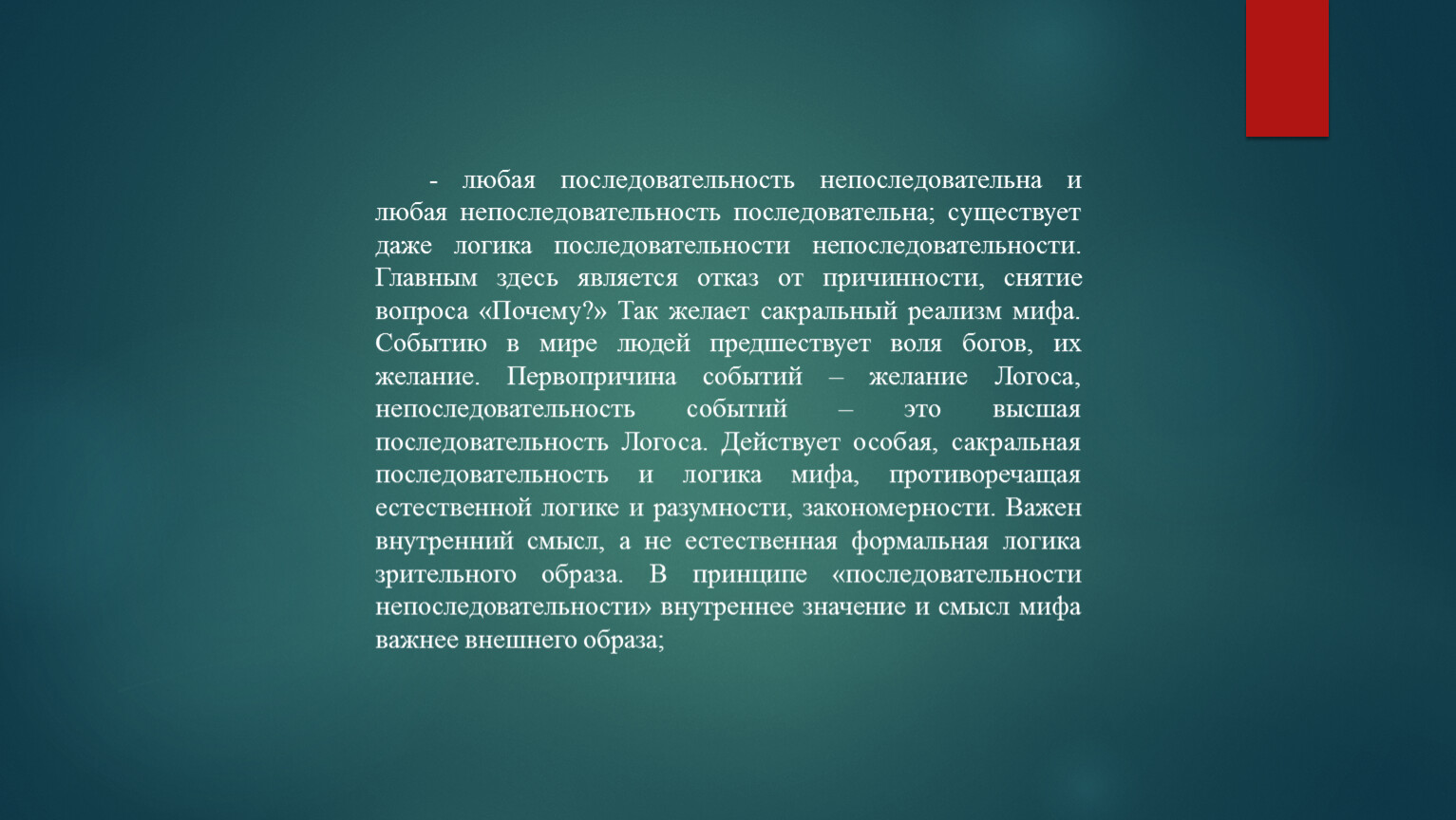 - любая последовательность непоследовательна и любая непоследовательность последовательна; существует даже логика последовательности непоследовательности. Главным здесь является отказ от причинности, снятие вопроса «Почему?» Так желает сакральный реализм мифа. Событию в мире людей предшествует воля богов, их желание. Первопричина событий – желание Логоса, непоследовательность событий – это высшая последовательность Логоса. Действует особая, сакральная последовательность и логика мифа, противоречащая естественной логике и разумности, закономерности. Важен внутренний смысл, а не естественная формальная логика зрительного образа. В принципе «последовательности непоследовательности» внутреннее значение и смысл мифа важнее внешнего образа;