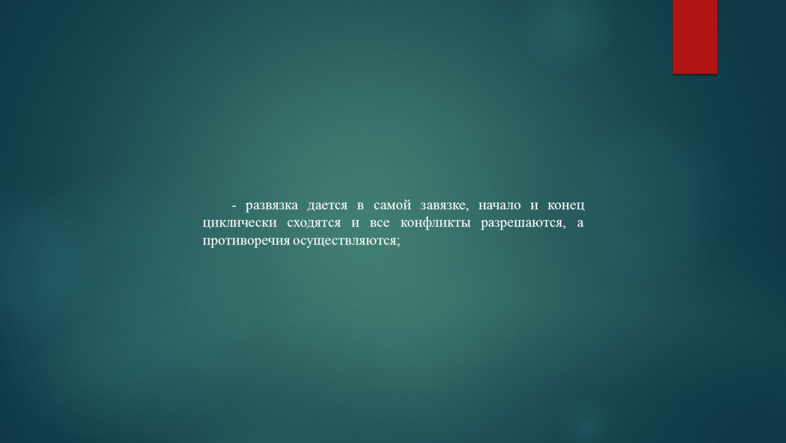 - развязка дается в самой завязке, начало и конец циклически сходятся и все конфликты разрешаются, а противоречия осуществляются;