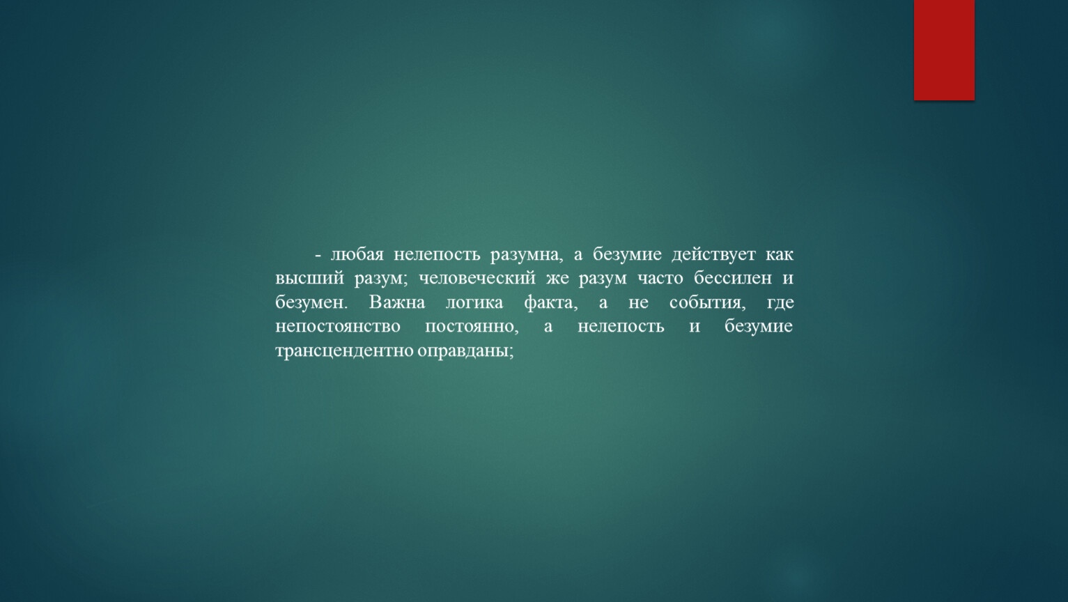 - любая нелепость разумна, а безумие действует как высший разум; человеческий же разум часто бессилен и безумен. Важна логика факта, а не события, где непостоянство постоянно, а нелепость и безумие трансцендентно оправданы;