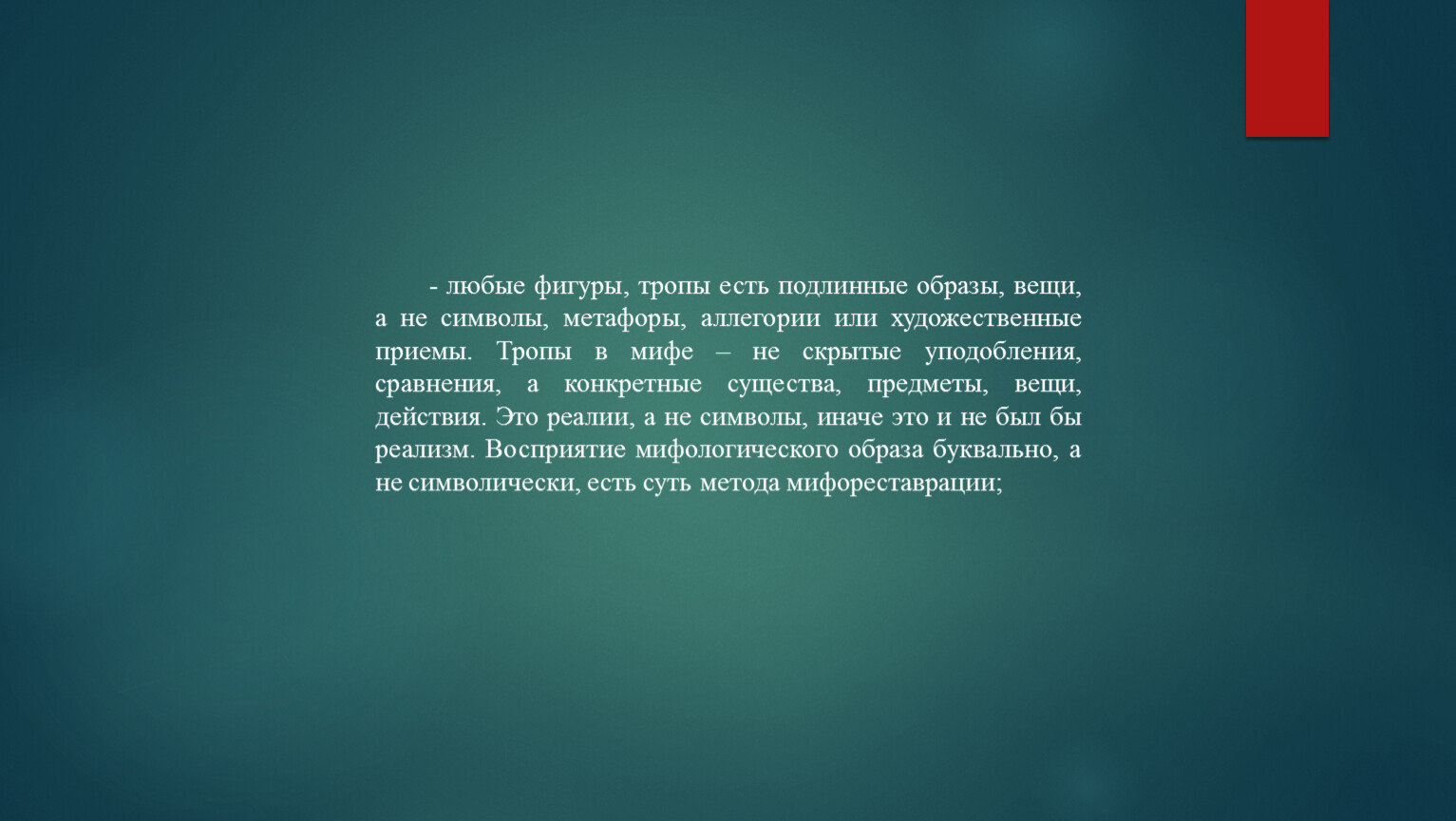 - любые фигуры, тропы есть подлинные образы, вещи, а не символы, метафоры, аллегории или художественные приемы. Тропы в мифе – не скрытые уподобления, сравнения, а конкретные существа, предметы, вещи, действия. Это реалии, а не символы, иначе это и не был бы реализм. Восприятие мифологического образа буквально, а не символически, есть суть метода мифореставрации;