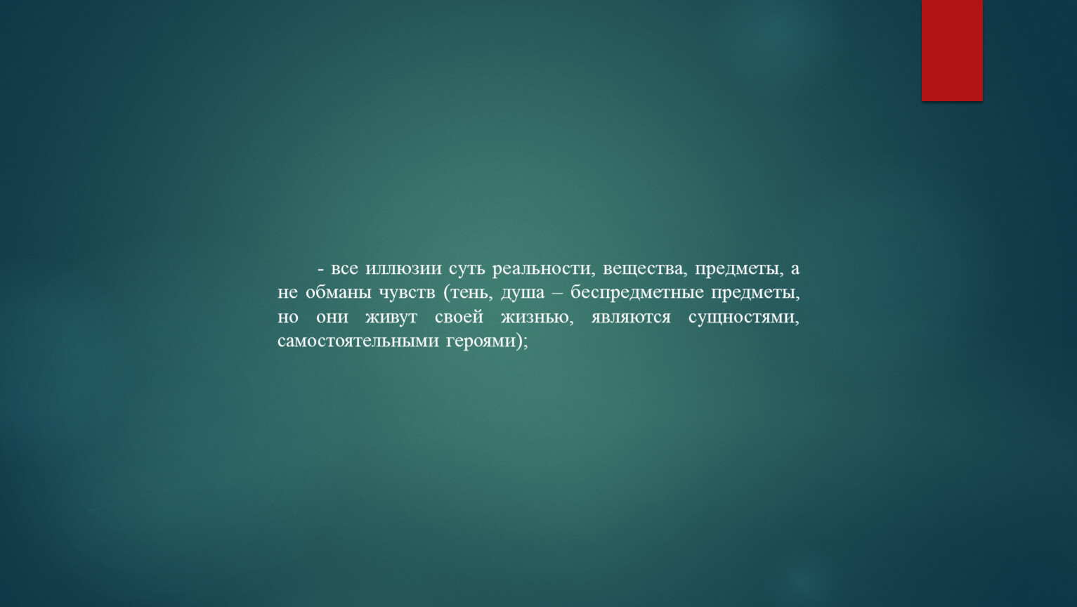 - все иллюзии суть реальности, вещества, предметы, а не обманы чувств (тень, душа – беспредметные предметы, но они живут своей жизнью, являются сущностями, самостоятельными героями);