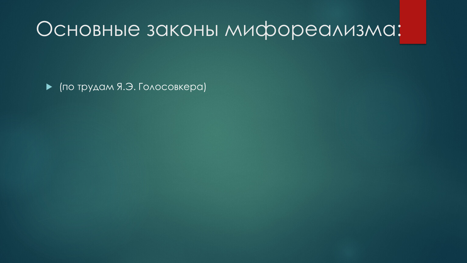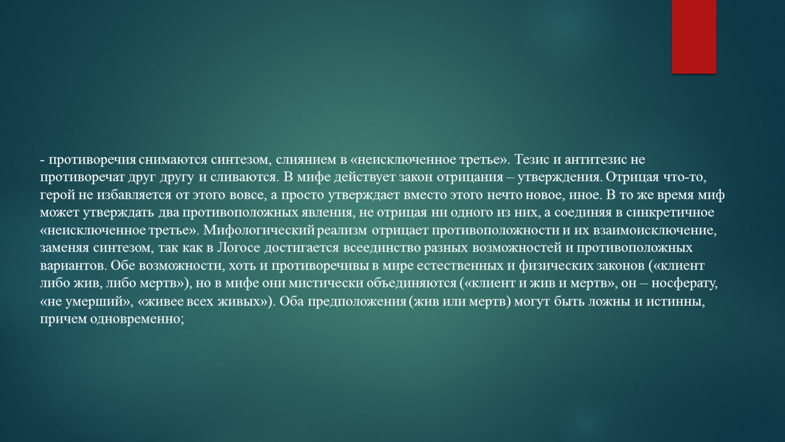 - противоречия снимаются синтезом, слиянием в «неисключенное третье». Тезис и антитезис не противоречат друг другу и сливаются. В мифе действует закон отрицания – утверждения. Отрицая что-то, герой не избавляется от этого вовсе, а просто утверждает вместо этого нечто новое, иное. В то же время миф может утверждать два противоположных явления, не отрицая ни одного из них, а соединяя в синкретичное «неисключенное третье». Мифологический реализм отрицает противоположности и их взаимоисключение, заменяя синтезом, так как в Логосе достигается всеединство разных возможностей и противоположных вариантов. Обе возможности, хоть и противоречивы в мире естественных и физических законов («клиент либо жив, либо мертв»), но в мифе они мистически объединяются («клиент и жив и мертв», он – носферату, «не умерший», «живее всех живых»). Оба предположения (жив или мертв) могут быть ложны и истинны, причем одновременно;
