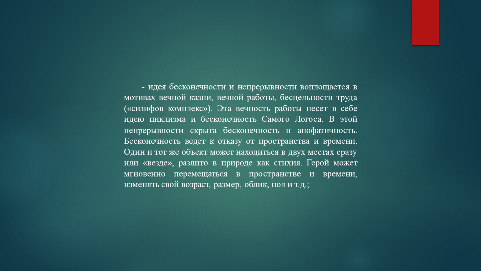 - идея бесконечности и непрерывности воплощается в мотивах вечной казни, вечной работы, бесцельности труда («сизифов комплекс»). Эта вечность работы несет в себе идею циклизма и бесконечность Самого Логоса. В этой непрерывности скрыта бесконечность и апофатичность. Бесконечность ведет к отказу от пространства и времени. Один и тот же объект может находиться в двух местах сразу или «везде», разлито в природе как стихия. Герой может мгновенно перемещаться в пространстве и времени, изменять свой возраст, размер, облик, пол и т.д.;