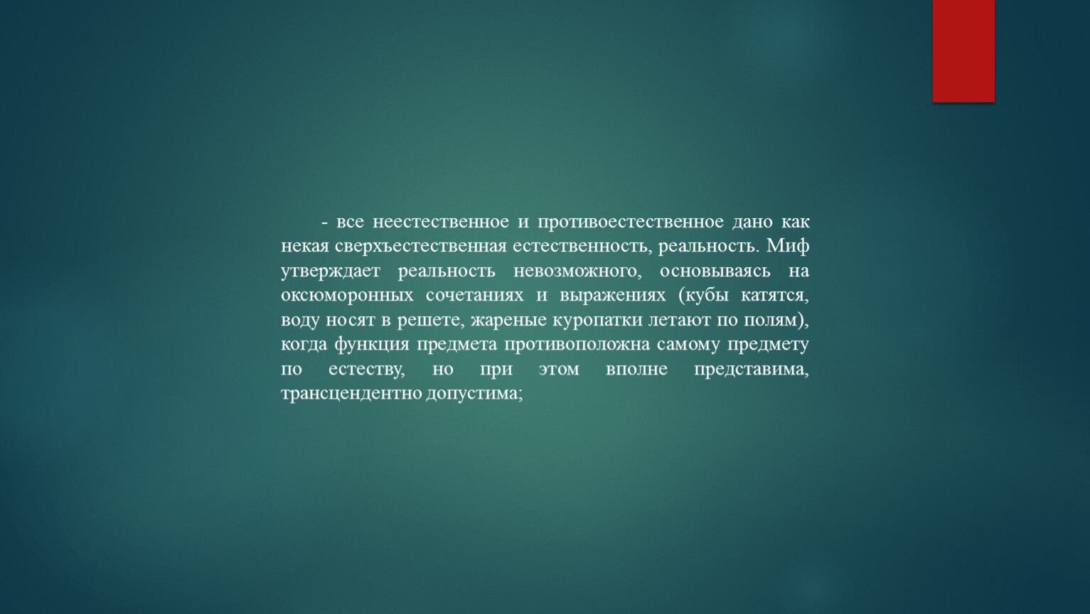 - все неестественное и противоестественное дано как некая сверхъестественная естественность, реальность. Миф утверждает реальность невозможного, основываясь на оксюморонных сочетаниях и выражениях (кубы катятся, воду носят в решете, жареные куропатки летают по полям), когда функция предмета противоположна самому предмету по естеству, но при этом вполне представима, трансцендентно допустима;