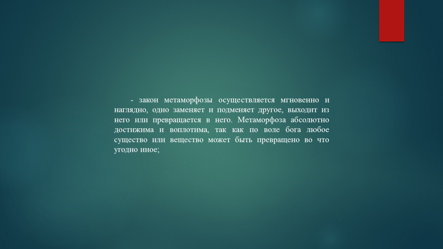 - закон метаморфозы осуществляется мгновенно и наглядно, одно заменяет и подменяет другое, выходит из него или превращается в него. Метаморфоза абсолютно достижима и воплотима, так как по воле бога любое существо или вещество может быть превращено во что угодно иное;