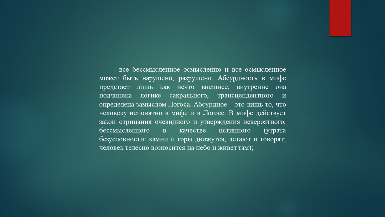 - все бессмысленное осмысленно и все осмысленное может быть нарушено, разрушено. Абсурдность в мифе предстает лишь как нечто внешнее, внутренне она подчинена логике сакрального, трансцендентного и определена замыслом Логоса. Абсурдное – это лишь то, что человеку непонятно в мифе и в Логосе. В мифе действует закон отрицания очевидного и утверждения невероятного, бессмысленного в качестве истинного (утрата безусловности: камни и горы движутся, летают и говорят; человек телесно возносится на небо и живет там);