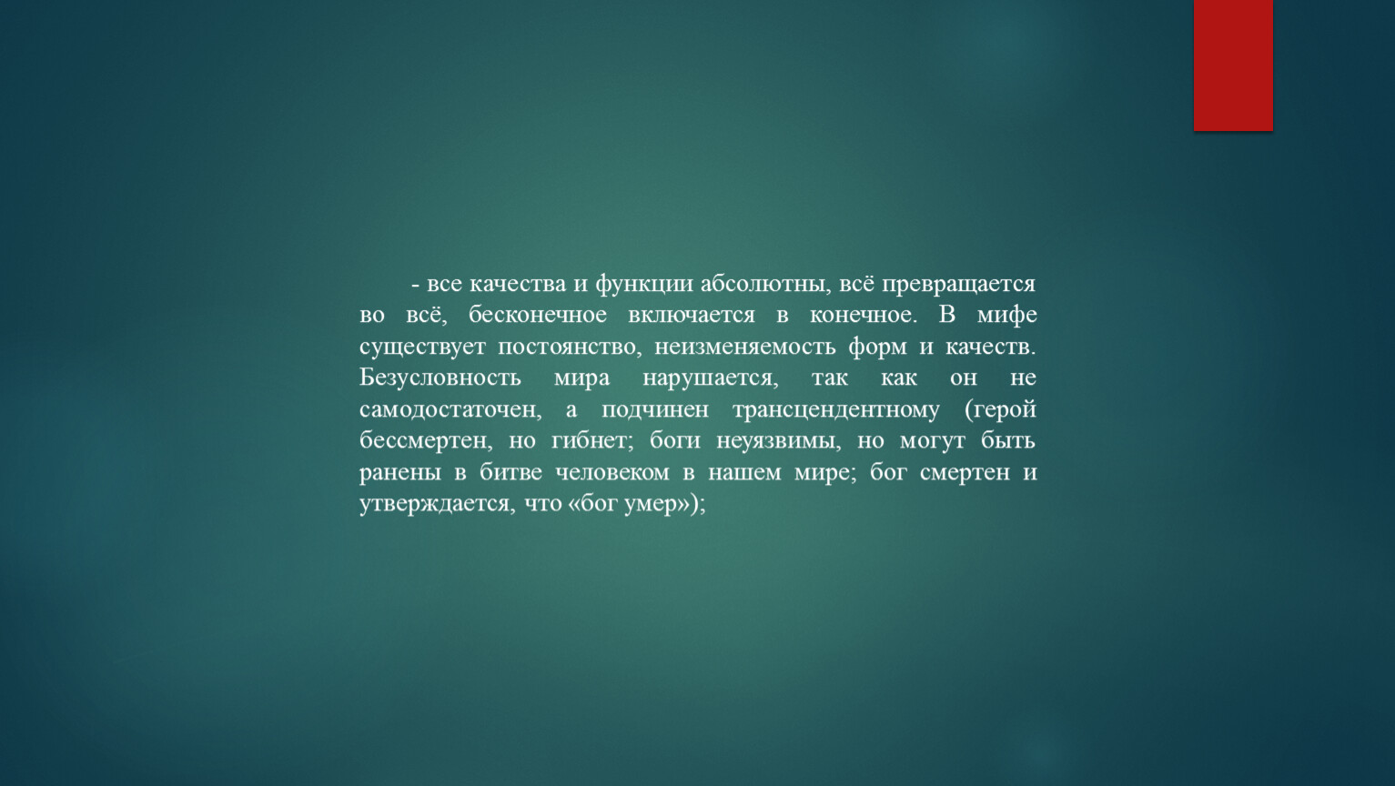 - все качества и функции абсолютны, всё превращается во всё, бесконечное включается в конечное. В мифе существует постоянство, неизменяемость форм и качеств. Безусловность мира нарушается, так как он не самодостаточен, а подчинен трансцендентному (герой бессмертен, но гибнет; боги неуязвимы, но могут быть ранены в битве человеком в нашем мире; бог смертен и утверждается, что «бог умер»);