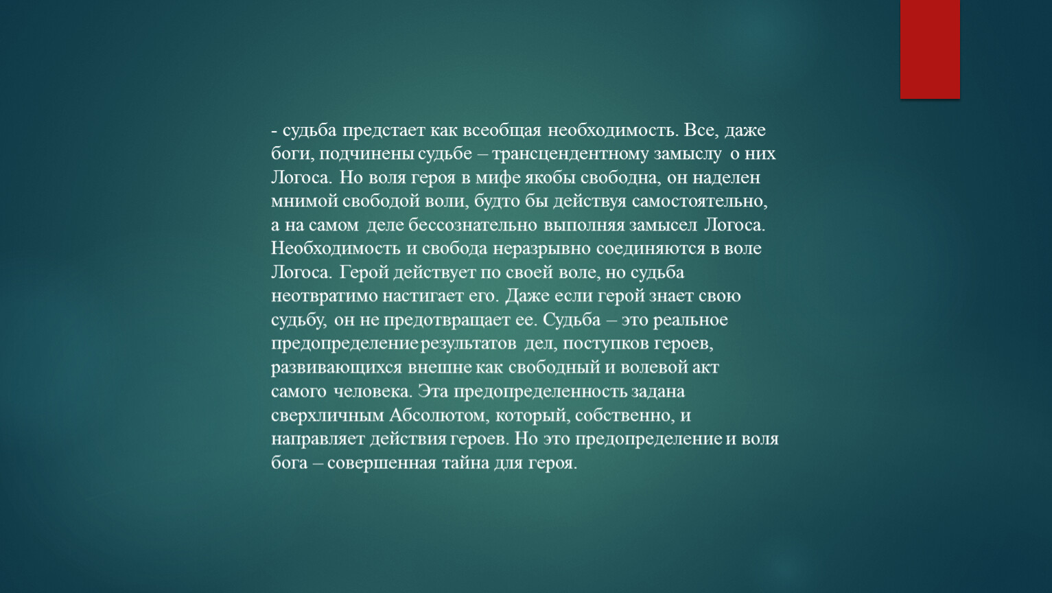 - судьба предстает как всеобщая необходимость. Все, даже боги, подчинены судьбе – трансцендентному замыслу о них Логоса. Но воля героя в мифе якобы свободна, он наделен мнимой свободой воли, будто бы действуя самостоятельно, а на самом деле бессознательно выполняя замысел Логоса. Необходимость и свобода неразрывно соединяются в воле Логоса. Герой действует по своей воле, но судьба неотвратимо настигает его. Даже если герой знает свою судьбу, он не предотвращает ее. Судьба – это реальное предопределение результатов дел, поступков героев, развивающихся внешне как свободный и волевой акт самого человека. Эта предопределенность задана сверхличным Абсолютом, который, собственно, и направляет действия героев. Но это предопределение и воля бога – совершенная тайна для героя.