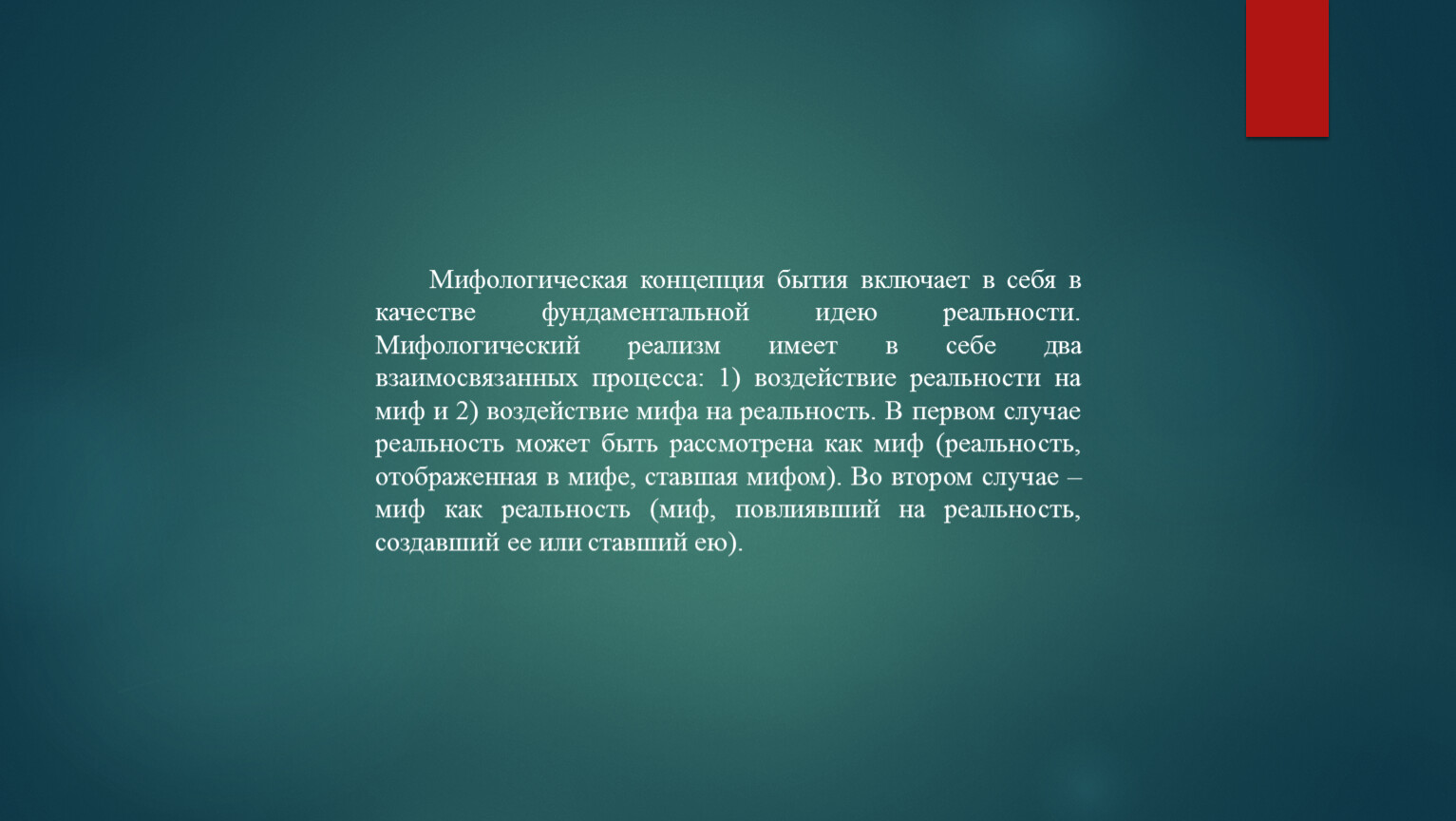 Мифологическая концепция бытия включает в себя в качестве фундаментальной идею реальности. Мифологический реализм имеет в себе два взаимосвязанных процесса: 1) воздействие реальности на миф и 2) воздействие мифа на реальность. В первом случае реальность может быть рассмотрена как миф (реальность, отображенная в мифе, ставшая мифом). Во втором случае – миф как реальность (миф, повлиявший на реальность, создавший ее или ставший ею).