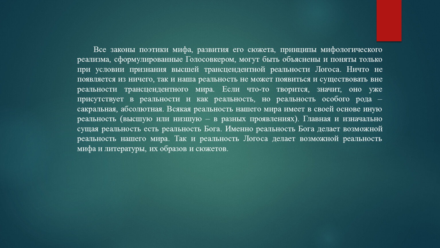 Все законы поэтики мифа, развития его сюжета, принципы мифологического реализма, сформулированные Голосовкером, могут быть объяснены и поняты только при условии признания высшей трансцендентной реальности Логоса. Ничто не появляется из ничего, так и наша реальность не может появиться и существовать вне реальности трансцендентного мира. Если что-то творится, значит, оно уже присутствует в реальности и как реальность, но реальность особого рода – сакральная, абсолютная. Всякая реальность нашего мира имеет в своей основе иную реальность (высшую или низшую – в разных проявлениях). Главная и изначально сущая реальность есть реальность Бога. Именно реальность Бога делает возможной реальность нашего мира. Так и реальность Логоса делает возможной реальность мифа и литературы, их образов и сюжетов.