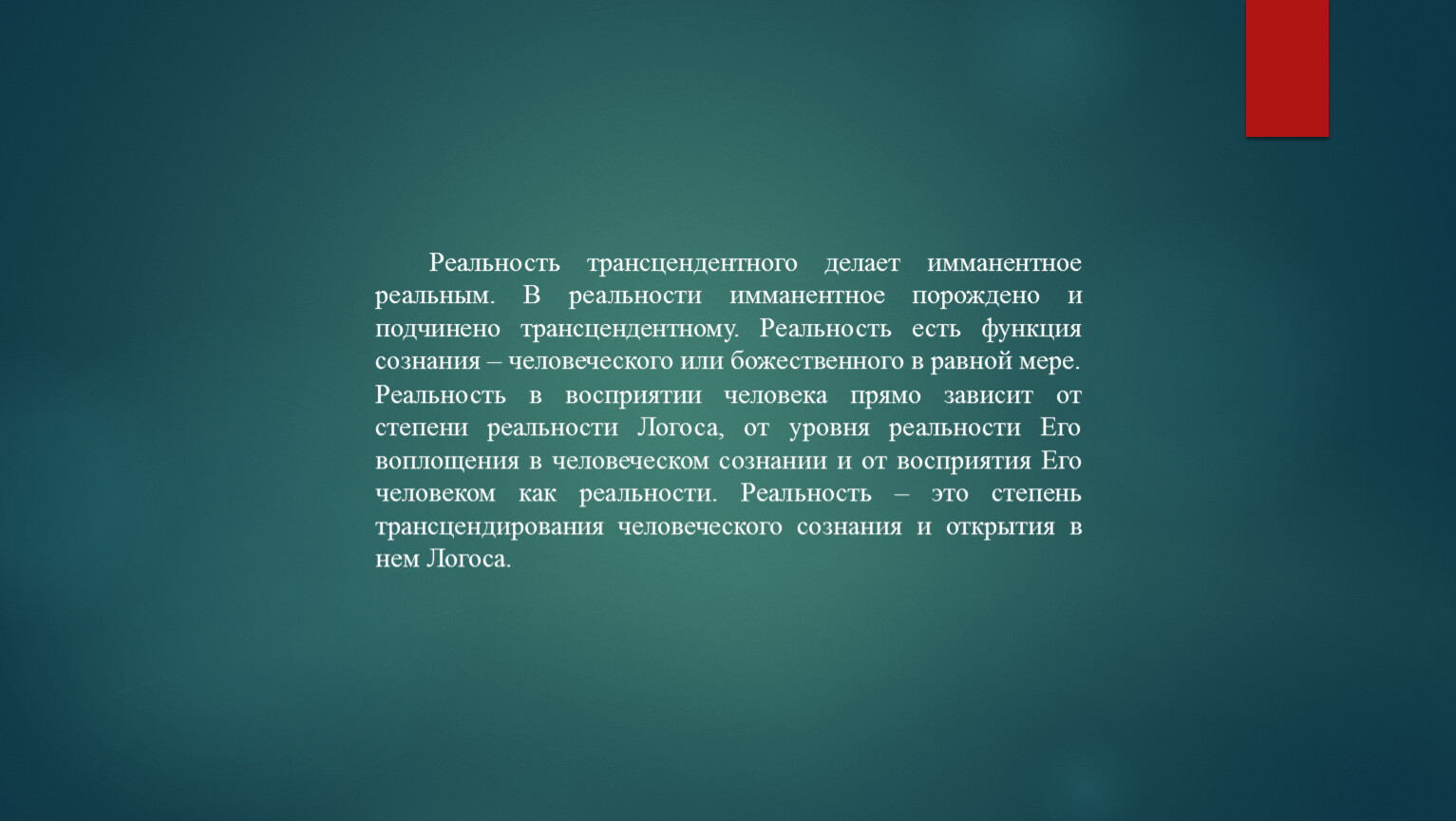Реальность трансцендентного делает имманентное реальным. В реальности имманентное порождено и подчинено трансцендентному. Реальность есть функция сознания – человеческого или божественного в равной мере. Реальность в восприятии человека прямо зависит от степени реальности Логоса, от уровня реальности Его воплощения в человеческом сознании и от восприятия Его человеком как реальности. Реальность – это степень трансцендирования человеческого сознания и открытия в нем Логоса.