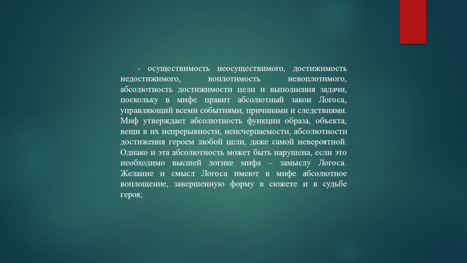 - осуществимость неосуществимого, достижимость недостижимого, воплотимость невоплотимого, абсолютность достижимости цели и выполнения задачи, поскольку в мифе правит абсолютный закон Логоса, управляющий всеми событиями, причинами и следствиями. Миф утверждает абсолютность функции образа, объекта, вещи в их непрерывности, неисчерпаемости, абсолютности достижения героем любой цели, даже самой невероятной. Однако и эта абсолютность может быть нарушена, если это необходимо высшей логике мифа – замыслу Логоса. Желание и смысл Логоса имеют в мифе абсолютное воплощение, завершенную форму в сюжете и в судьбе героя;